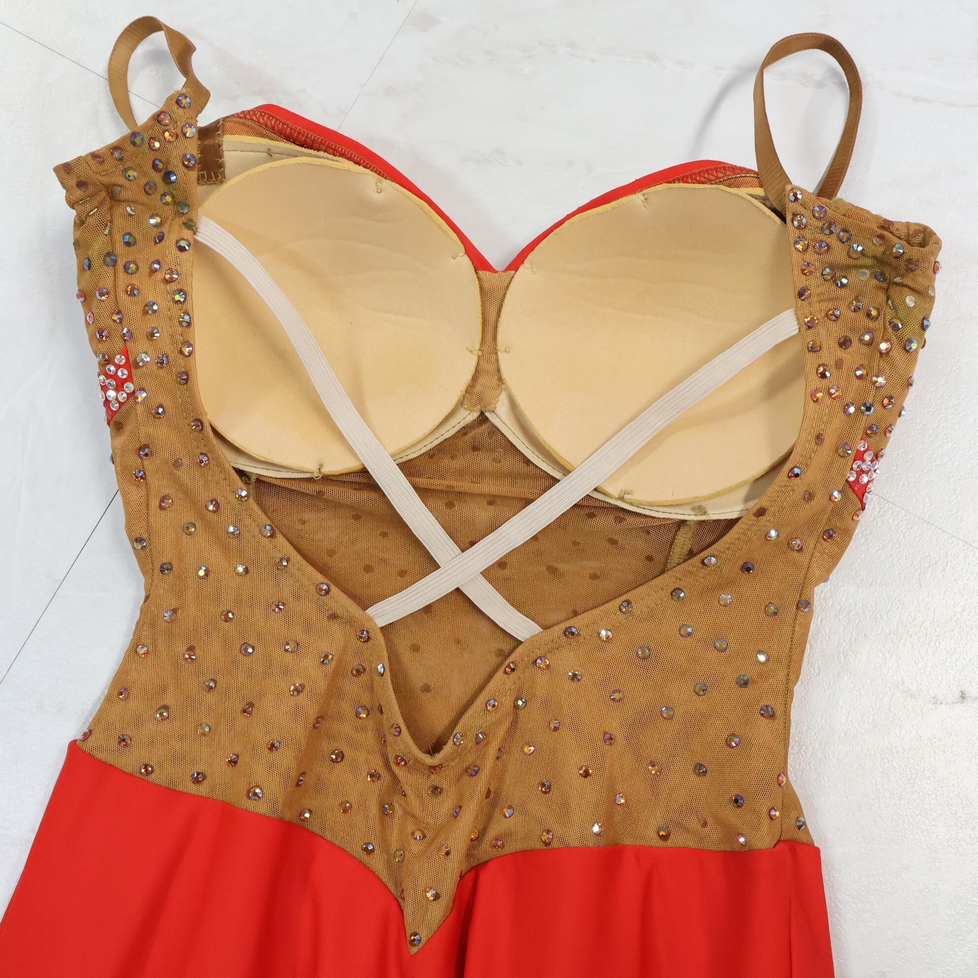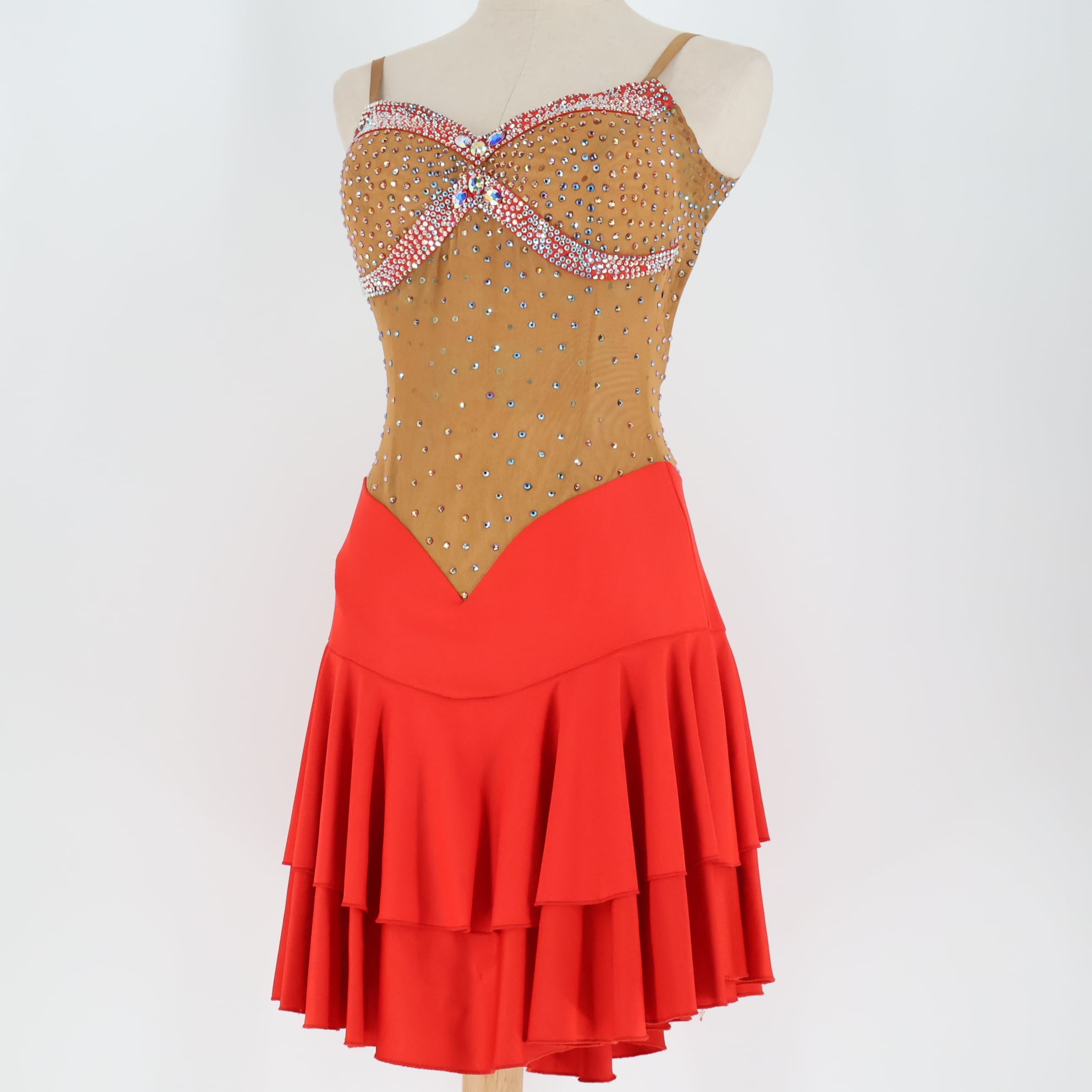 【社交ダンス衣装】レッド ラテン ドレス ワンピース 赤 ベージュ ラインストーン ビーズ お洒落 豪華 華やか フリル レース