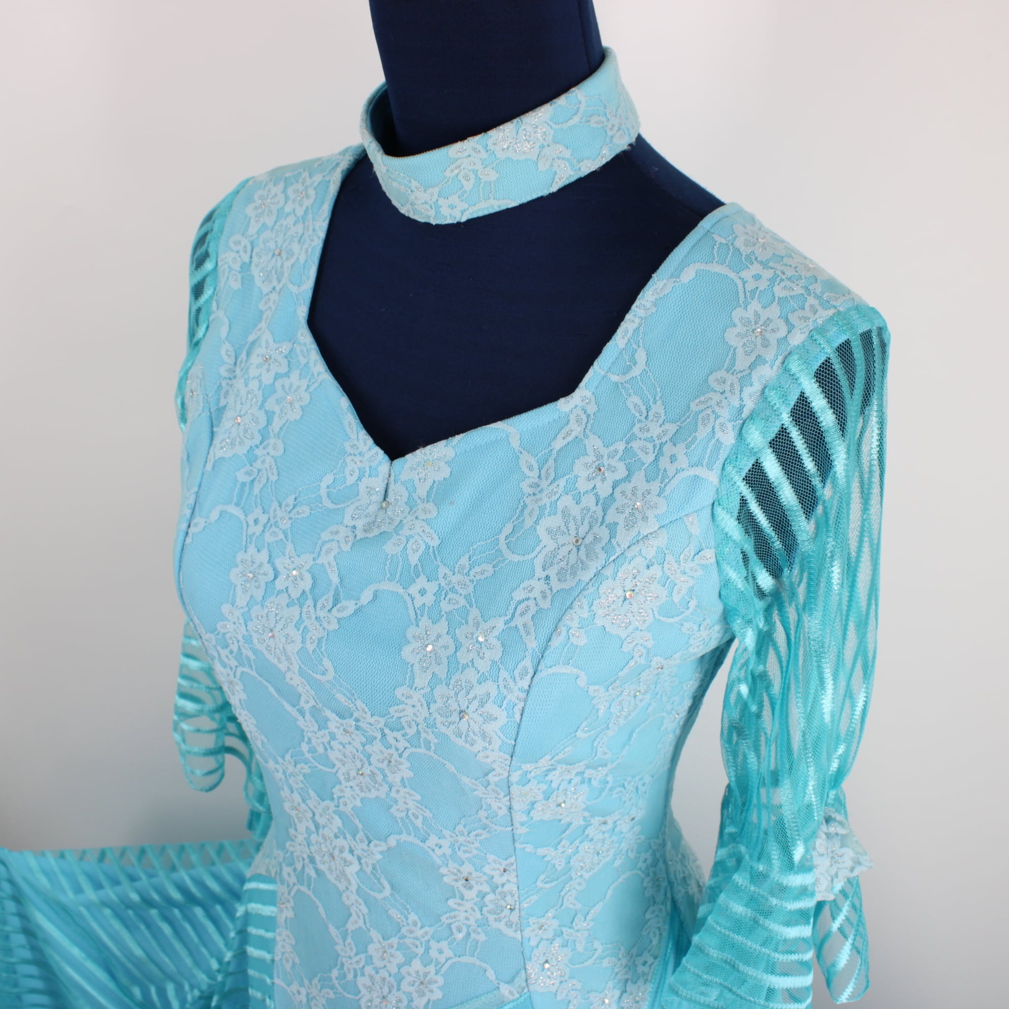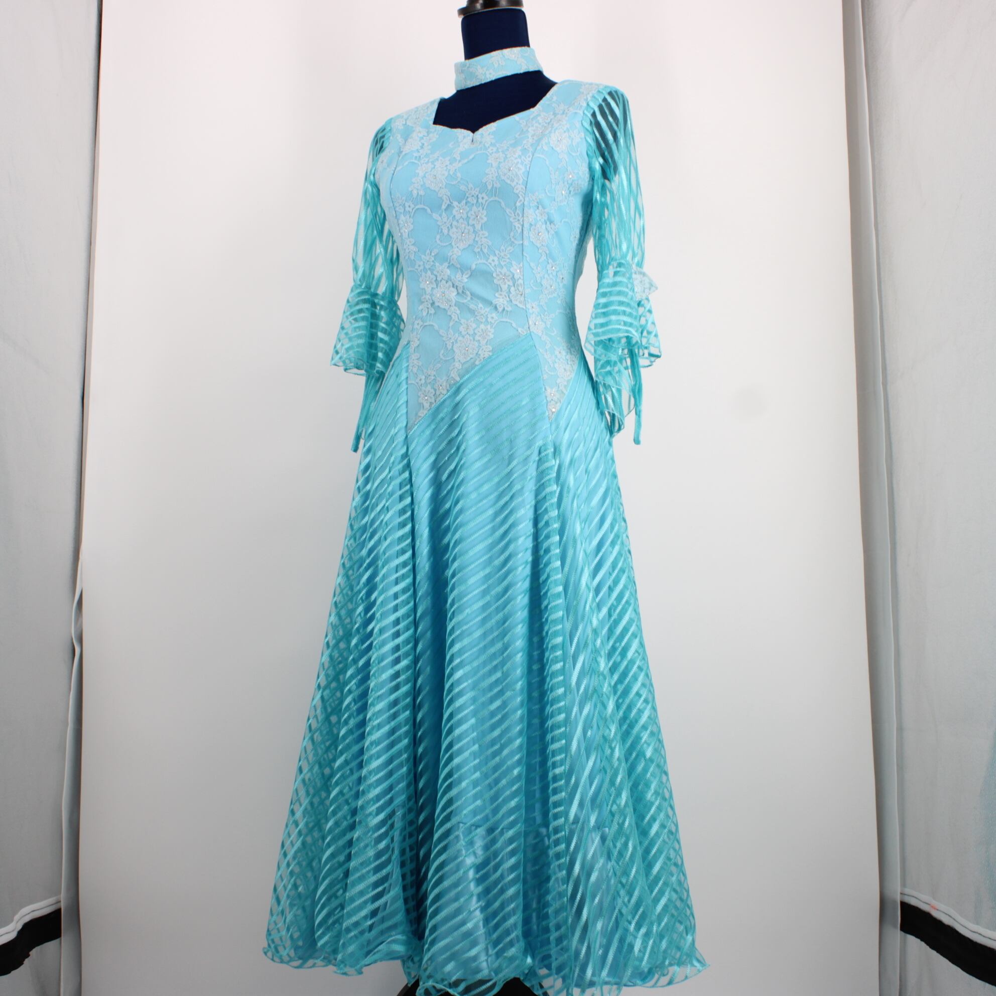 【美品 社交ダンス衣装】ワンピースドレス チョーカー 水色 ライトブルー ラインストーン レース 花柄 かわいい フェミニン