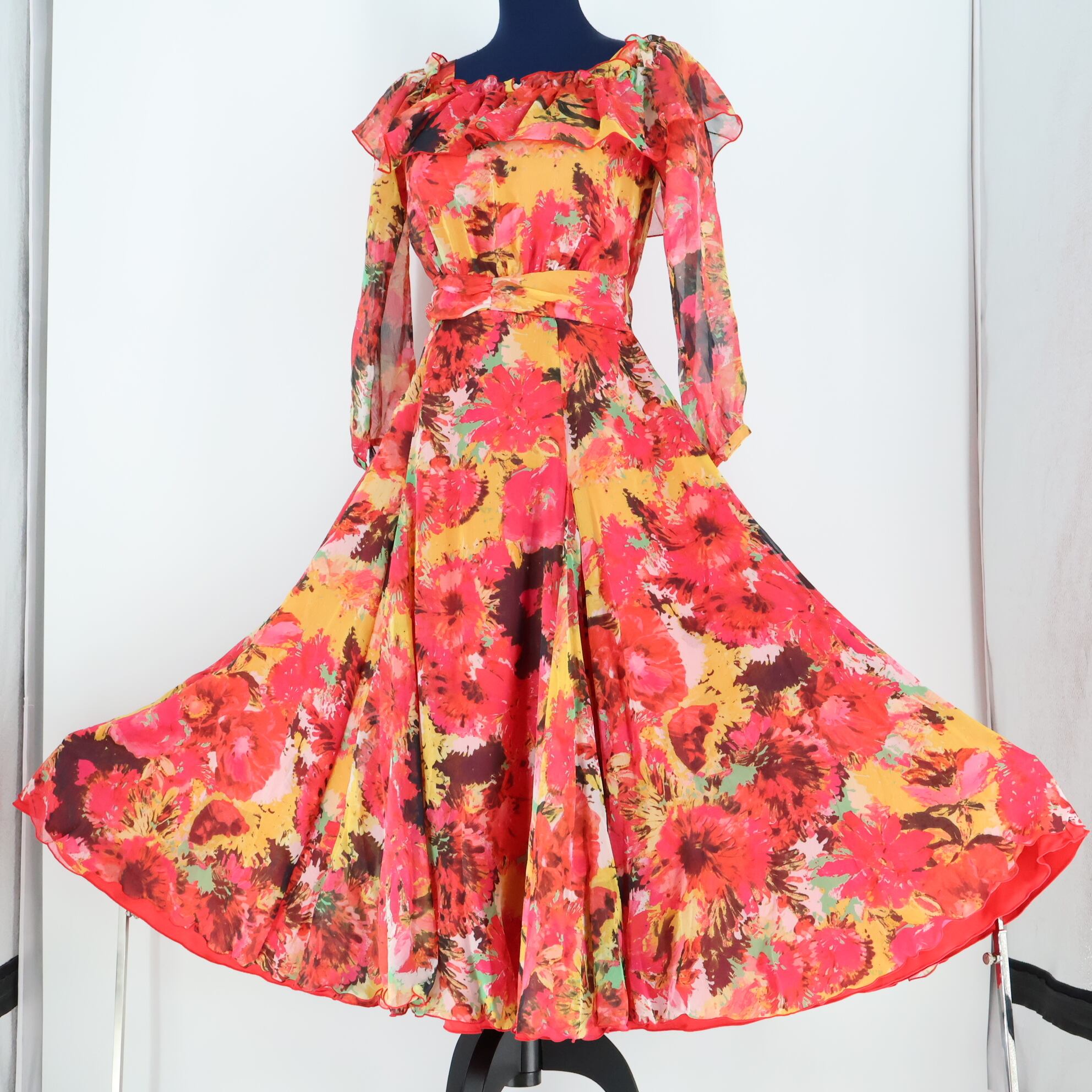 【美品 日本製 社交ダンス衣装】ピンク PASTIME パスタイム ワンピース ドレス 花柄 長袖 レース フリル 軽い レッド 黄色