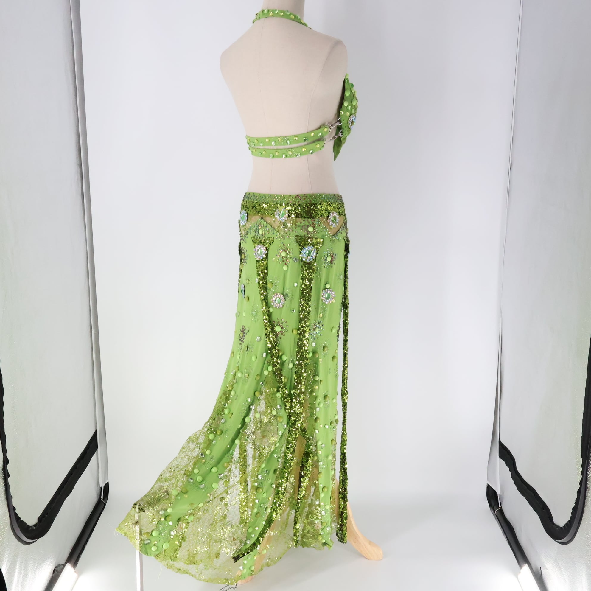 【ベリーダンス用 オリエンタル衣装】黄緑色 ラインストーン 豪華 シルバー レース スパンコールラメ 花柄 爽やか 煌びやか ブラトップ スカートセット インナーショーツ付き 輝き セクシー