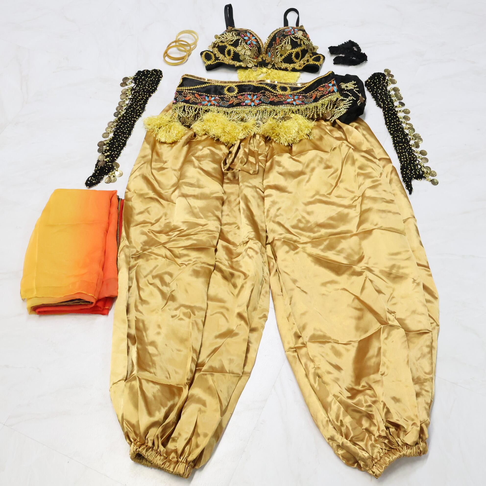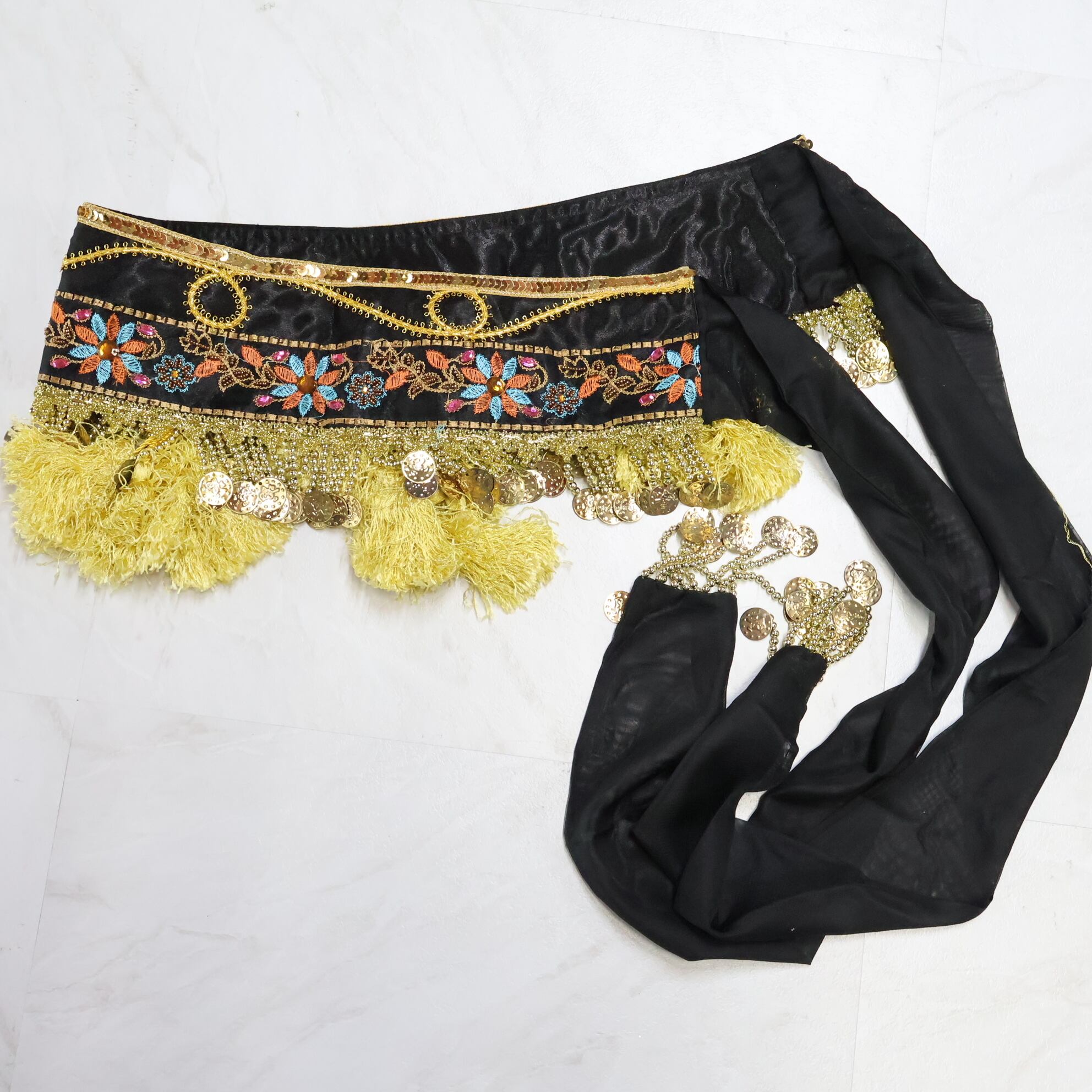 【ベリーダンス用 民族衣装】ゴールド×ブラック Qiaoshi ビーズ ゴールドコイン 刺繍 花柄 黒 光沢 ブラトップ ベルト ズボン アクセサリー付き 煌びやか スパンコールラメ ズボン