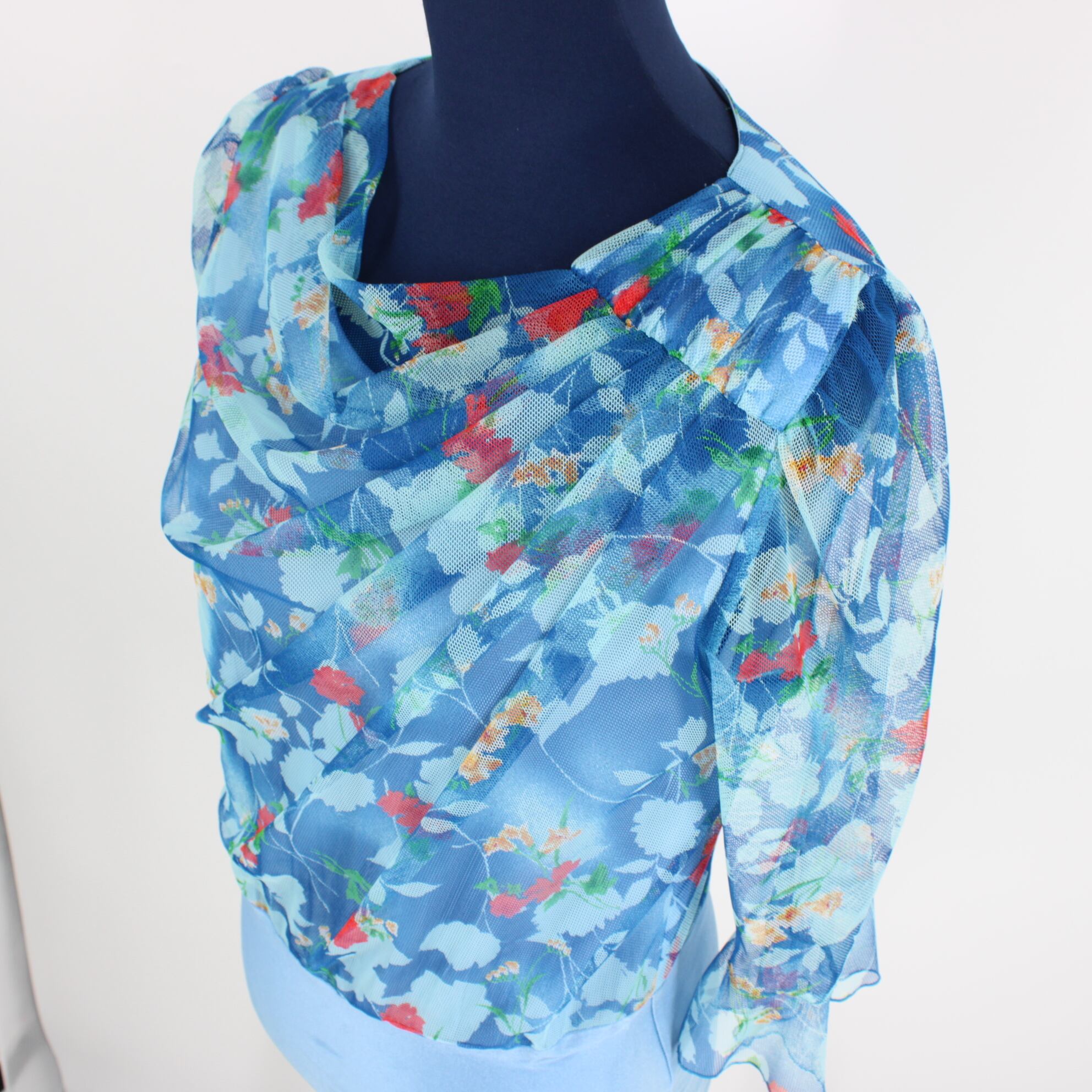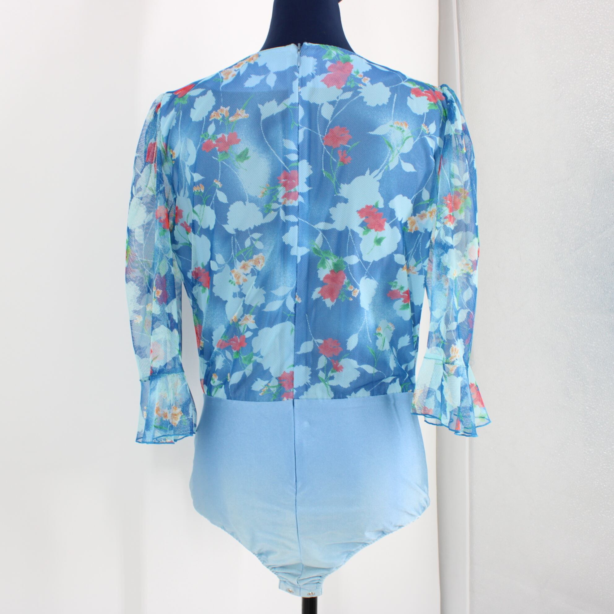 【美品 日本製社交ダンス衣装】トップス Sanline サンリーヌ Mサイズ 青 ブルー 水色 ライトブルー 花柄 レオタード かわいい