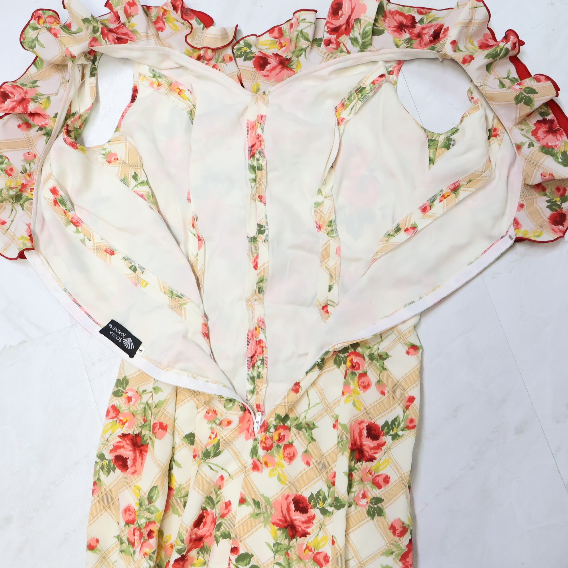 【美品 フラメンコ衣装】アイボリー SONIA JOHNES ソニアジョーンズ ワンピース ドレス ボランテ 花柄 フリル レッド 赤 茶色 薔薇柄 カントリー調 ブラウン チェック レディース ダンス用 発表会 ボリューム 明るい