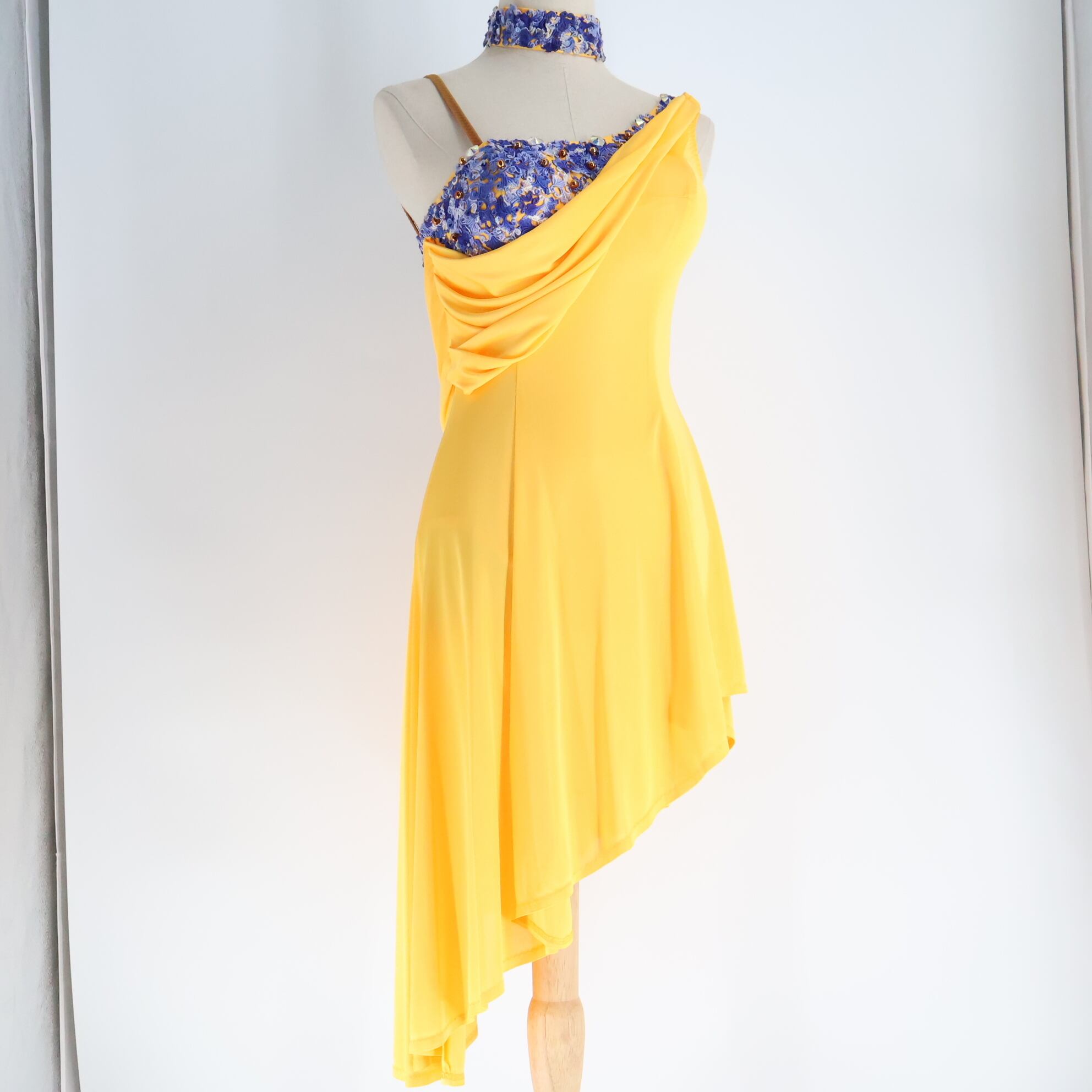 【美品 日本製 社交ダンス衣装】イエロー ラテン ドレス ワンピース 黄色 ブルー 青 装飾 花 チョーカー ブレスレット 水色
