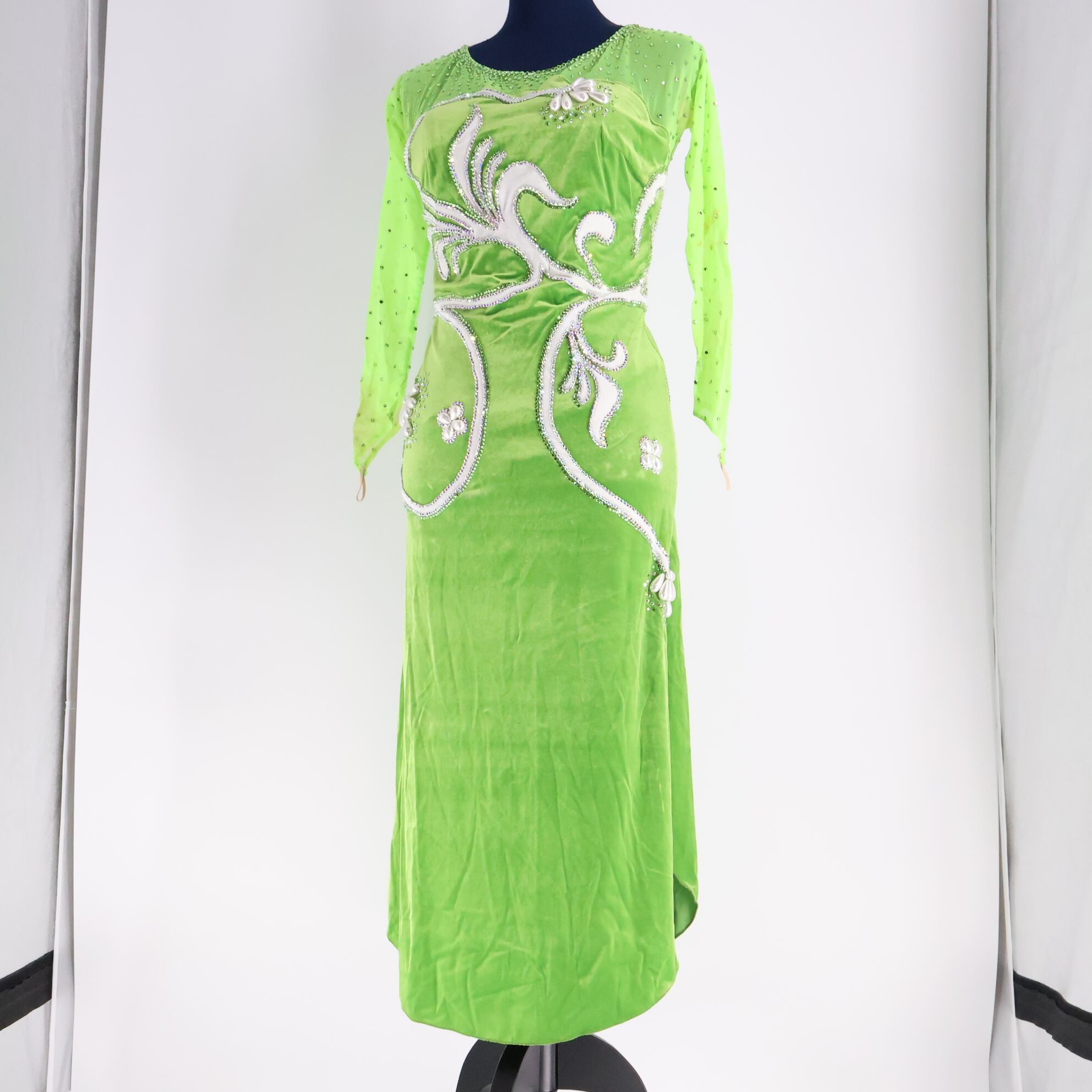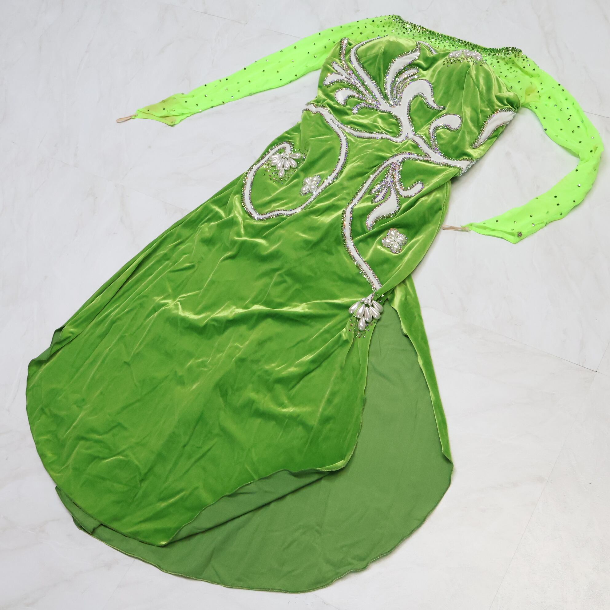 #社交ダンス衣装 #ラテンドレス #グリーン #ベロア #抹茶色 #ビーズ装飾 #個性的デザイン #白い装飾 #スリット入り #パーティードレス #発表会衣装 #デモ用衣装 #競技用ドレス #レディースダンスウェア #黄緑色 #長袖ドレス #ダンス衣装販売 #中古ダンス衣装 #ダンスコスチューム #ステージ衣装 #ダンスファッション#ENUTSU