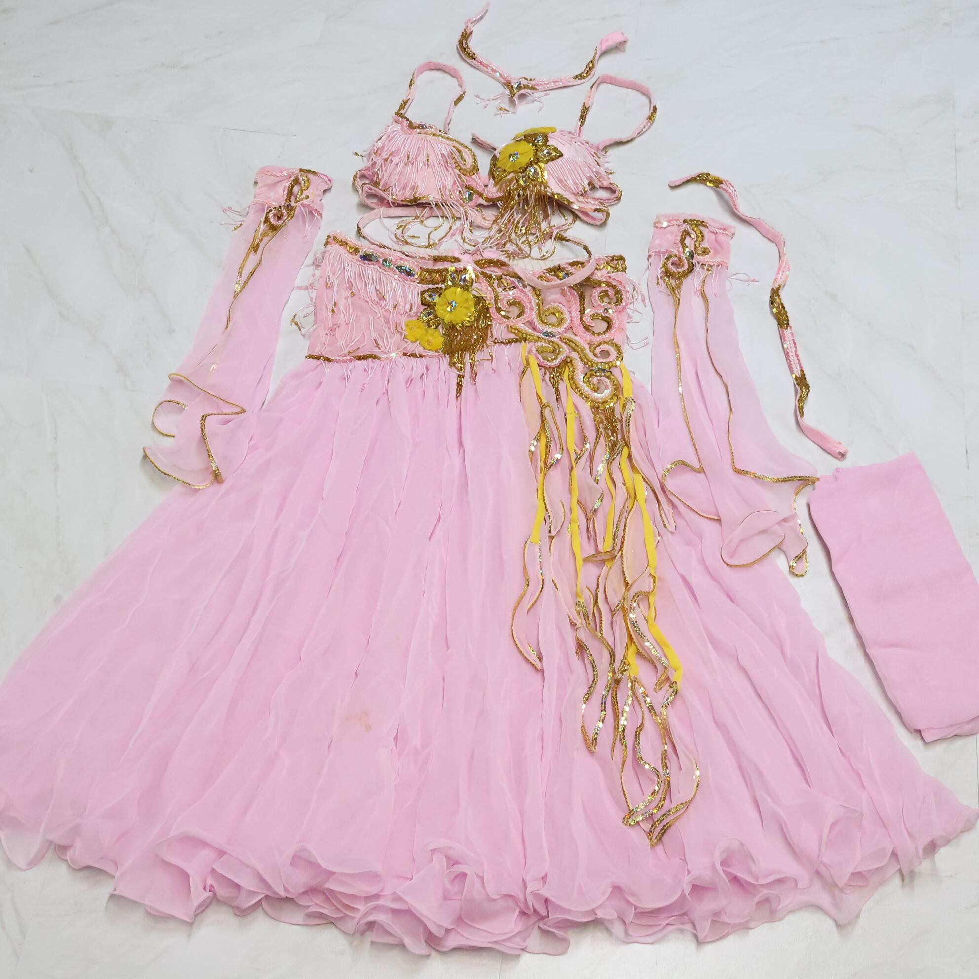#ベリーダンス #オリエンタル衣装 #薄ピンク #ラインストーン #ビーズ #ゴールド #花柄 #フリル #レース #ベロア生地 #可愛い #ブラトップ #スカート #アクセサリーセット #スパンコール #ラメ #女性らしい #華やか #ダンス衣装 #deuxiemer#ダンス衣装 #ダンスコスチューム #ステージ衣装 #古着 #中古 #ENUTSU