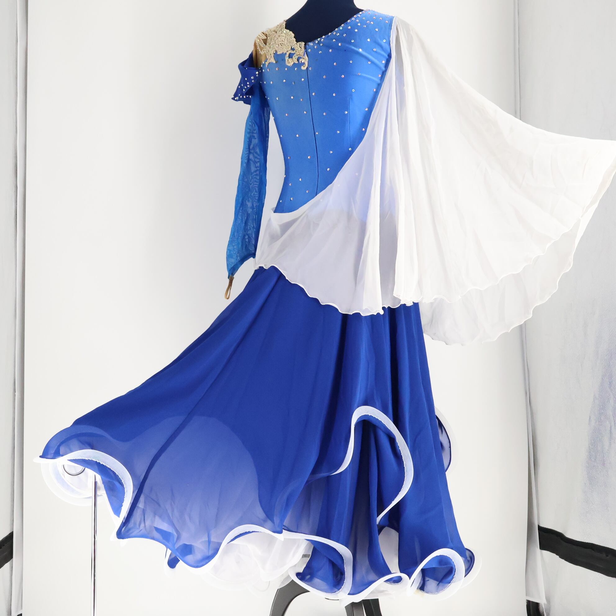 【社交ダンス衣装】ブルー ワンピース ドレス フロート 青 レース 白 ホワイト フリル ゴールド 金 ラインストーン ダンス用 レディース 女性用 レオタード クロッチ 高級感 上品 伸縮 Lサイズ デモ 競技用 発表会