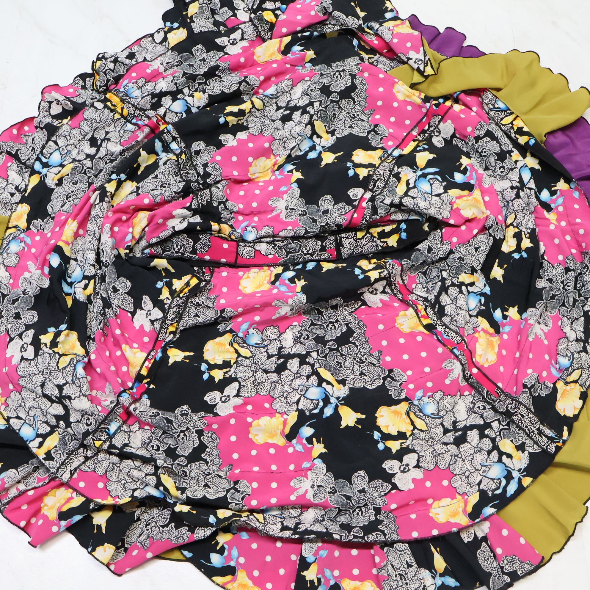 【フラメンコ衣装】ブラック SONIA JOHNES ソニアジョーンズ 上下セット ツーピース シージョ付き 黒 ボランテ 柄 紫 ブラウス ピキージョ ファルダ トスカート トップス 袖なし レース ダンス用 発表会 レディース 模様 ドット 水玉