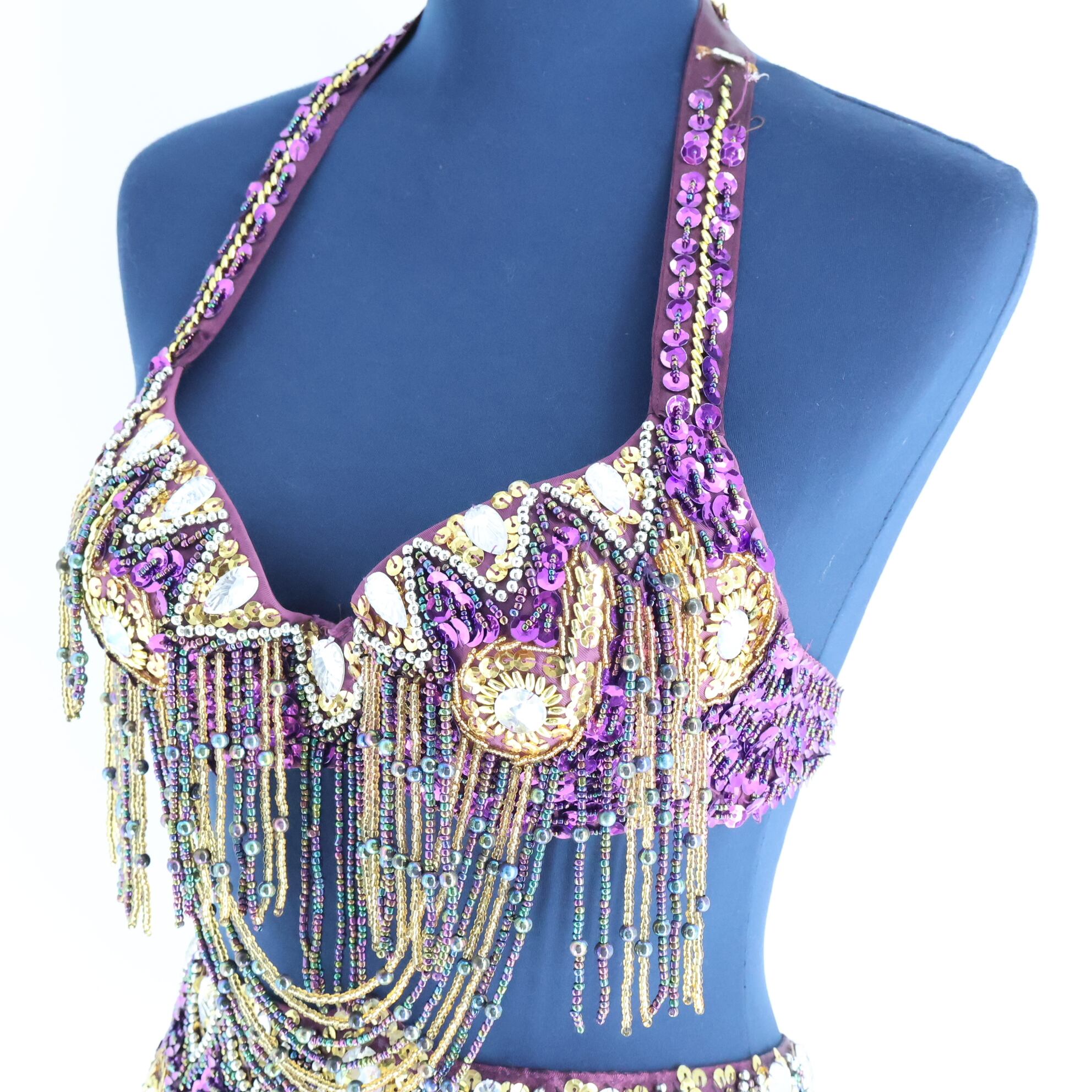 【ベリーダンス用オリエンタル衣装】パープル スパンコールラメ ビーズ 豪華 紫 ゴールド 2点セット 鮮やか ラインストーン ブラトップ ベルトセット