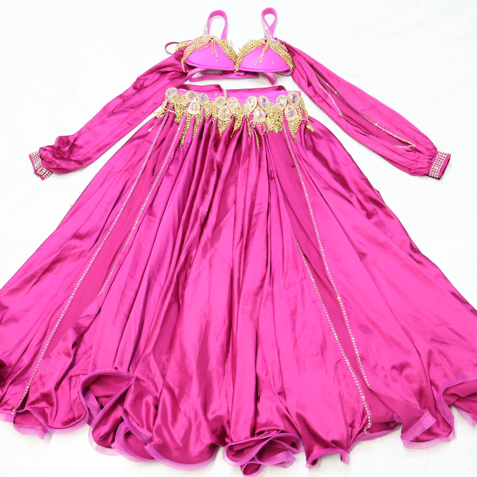 【ベリーダンス用 オリエンタル衣装】ショッキングピンク ラインストーン 豪華 サテン生地 ゴールドラメ ゴージャス 可愛い ブラトップ スカート インナーショーツセット 華やか 煌びやか スリット入り 袖有り 女性らしい