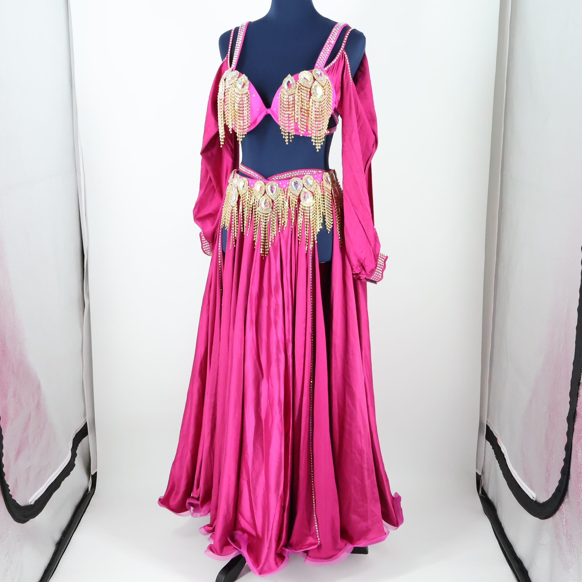 #ベリーダンス #オリエンタル衣装 #ショッキングピンク #ラインストーン #サテン生地 #ゴールドラメ #豪華衣装 #女性らしい #ダンス衣装 #華やか #煌びやか #スリット入り #ダンスファッション #ベリーダンス衣装 #セクシーコスチューム #ゴージャス #インナーショーツ #袖あり #エキゾチックダンス #ダンススタイル #ピンクコスチューム #ダンスコスチューム #ステージ衣装 #古着 #中古 #ENUTSU