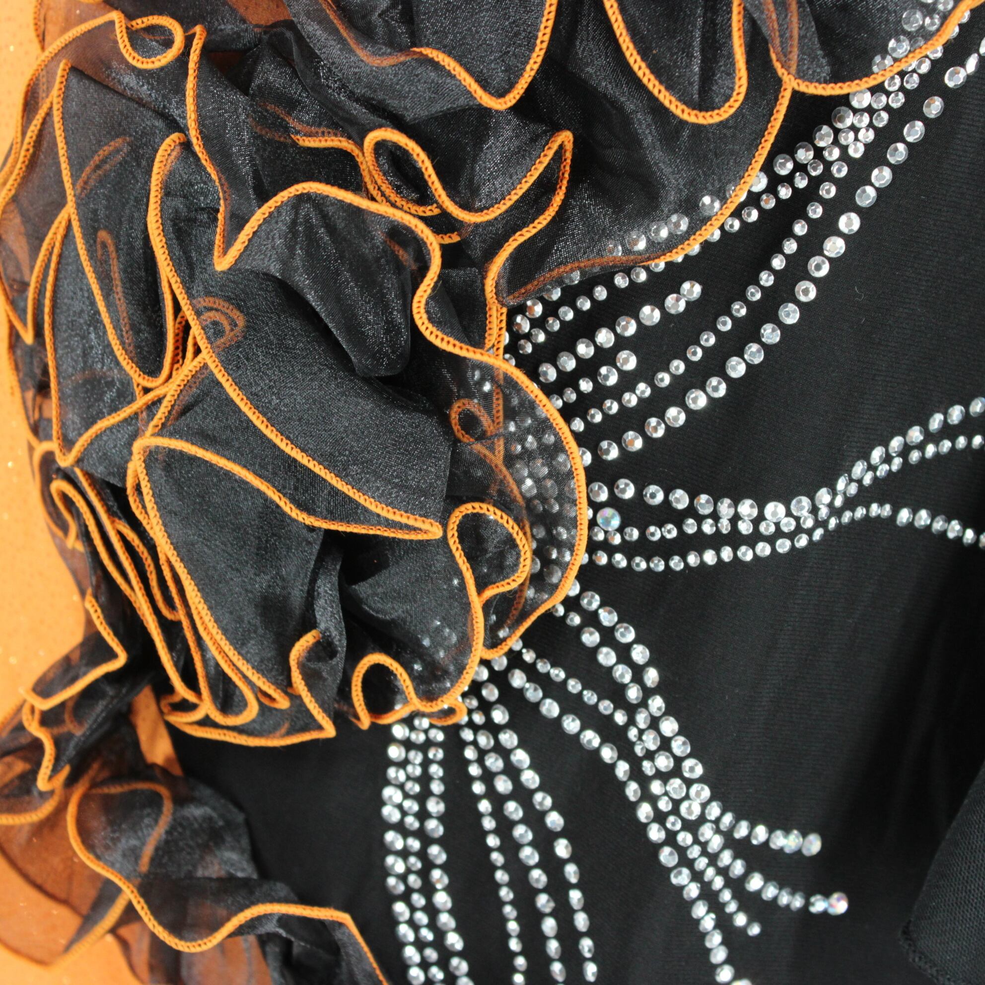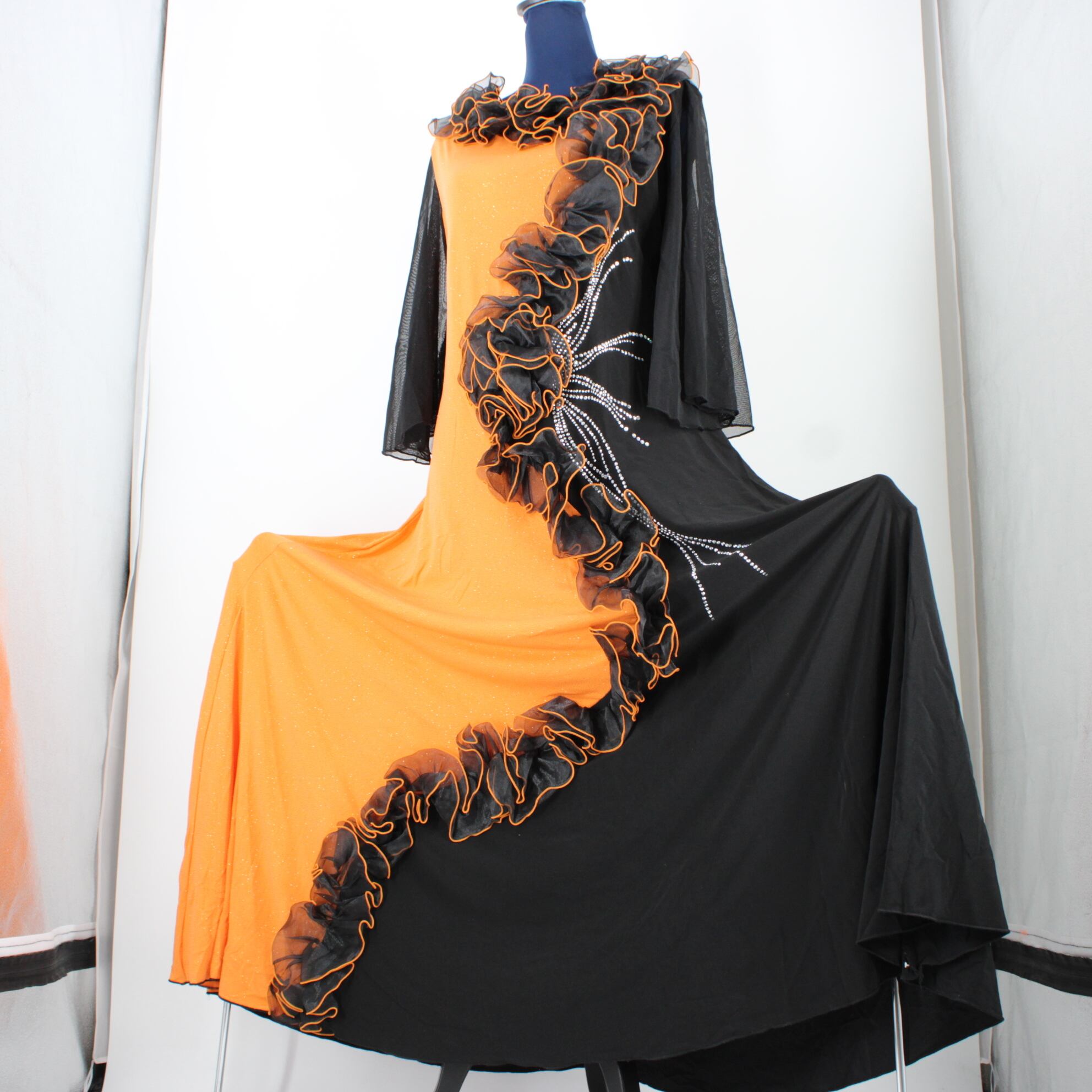 【美品 社交ダンス衣装】ワンピース ドレス オレンジ ブラック 黒 ラインストーン かわいい バイカラー 可愛い 派手 華やか