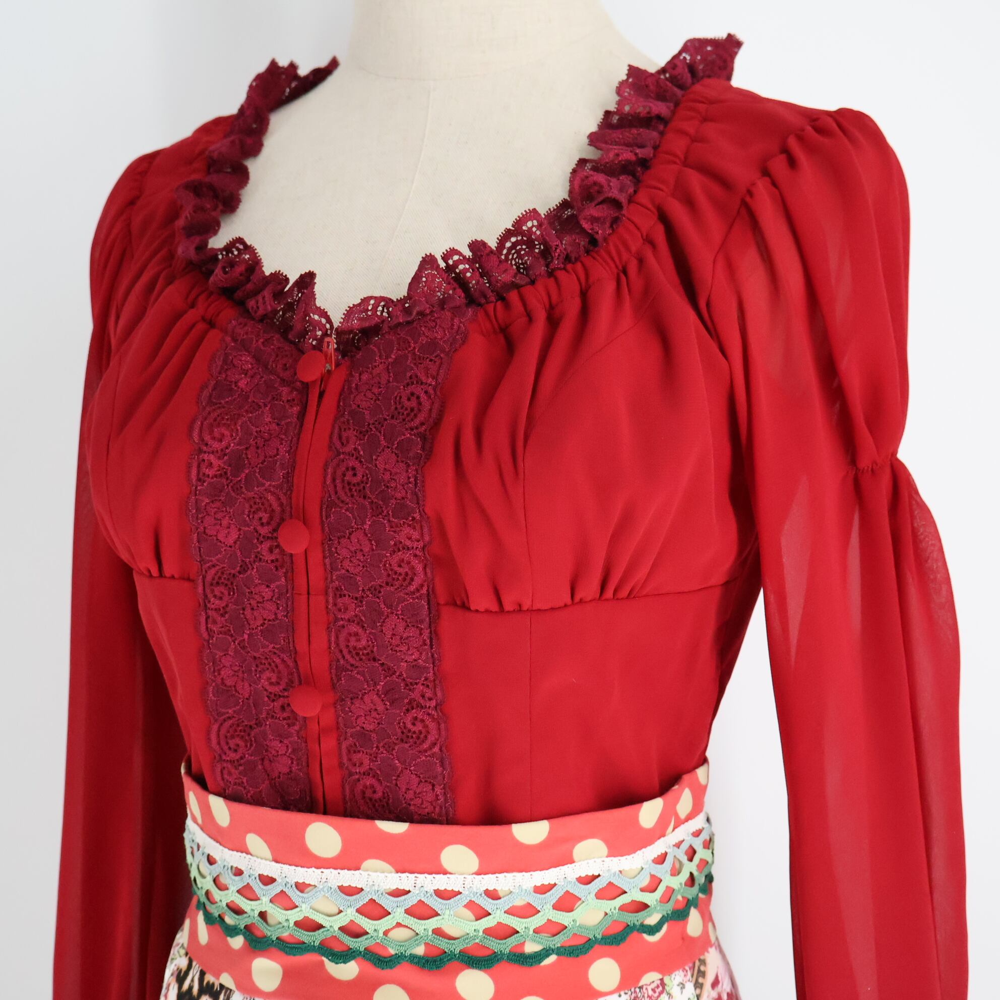 【美品 フラメンコ衣装】レッド SONIA JOHNES ソニアジョーンズ 上下セット ファルダ ブラウス 赤 ボランテ フリル 水玉 花柄 レース ピンク ホワイト 白 紫 薔薇 長袖 袖有り ドット ダンス用 ハイウエスト レディース 発表会