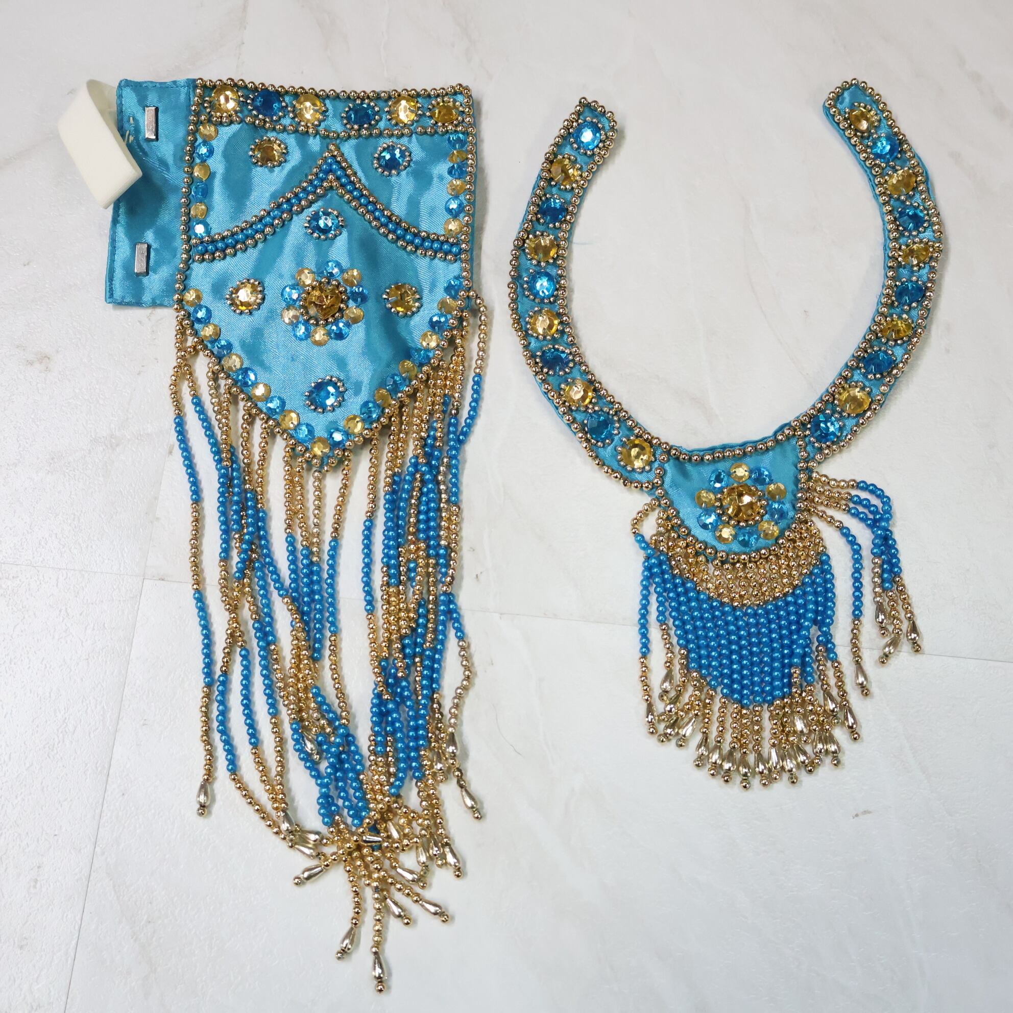【ベリーダンス用オリエンタル衣装】水色×ゴールド ラインストーン ビーズ 豪華 青 アクセサリー付き 煌びやか 爽やか ラメ ブラトップ ベルト