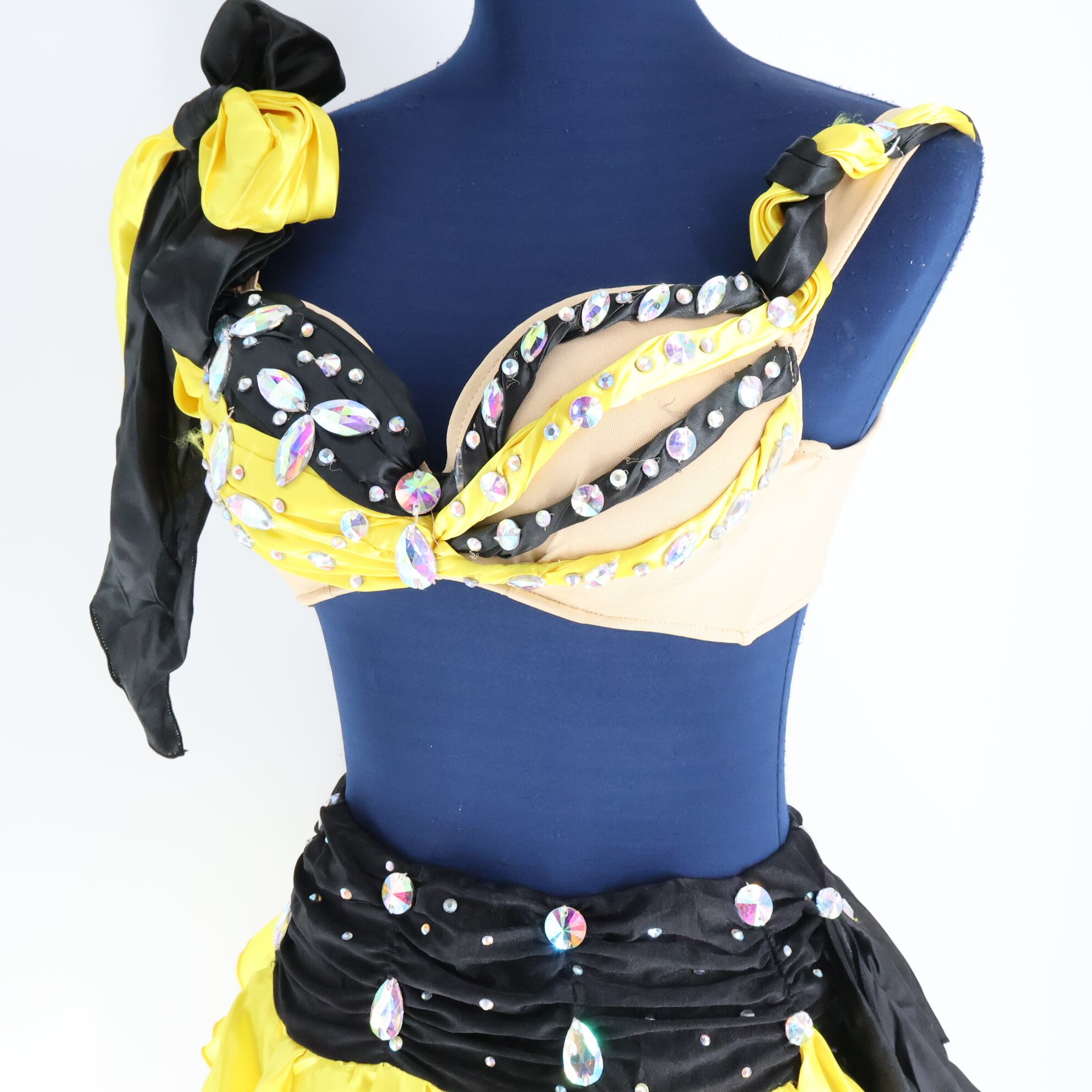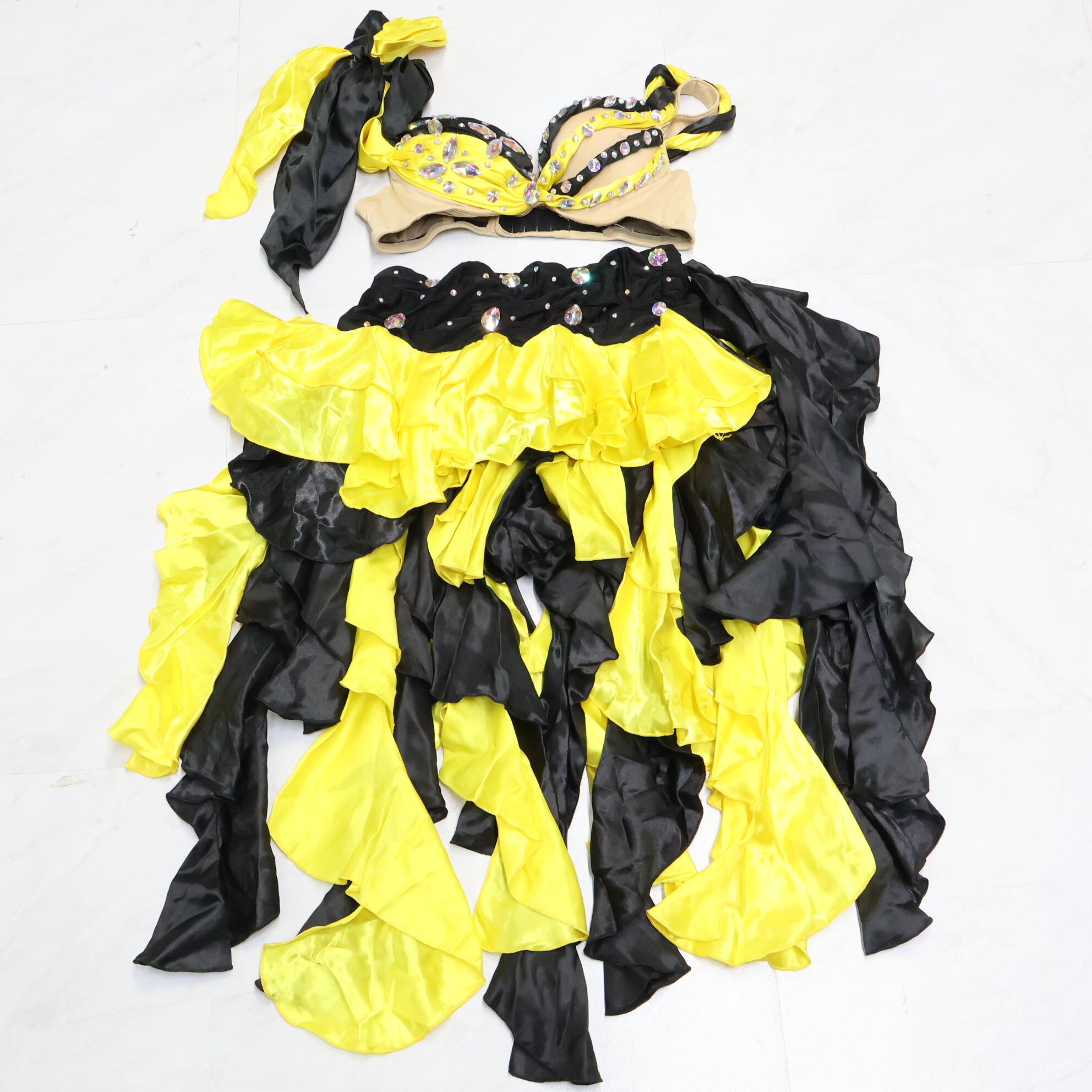 #ベリーダンス #オリエンタル衣装 #イエロー衣装 #ブラックアクセント #ラインストーン #フリルデザイン #サテン生地 #セクシースタイル #ブラトップ #スカートセット #華やか衣装 #ステージ衣装 #ダンスファッション #特別なパフォーマンス #ショート丈トップ #エレガントスタイル #パフォーマンス用 #個性的デザイン #煌びやか #鮮やかカラー #ダンス衣装 #ダンスコスチューム #ステージ衣装 #古着 #中古 #ENUTSU