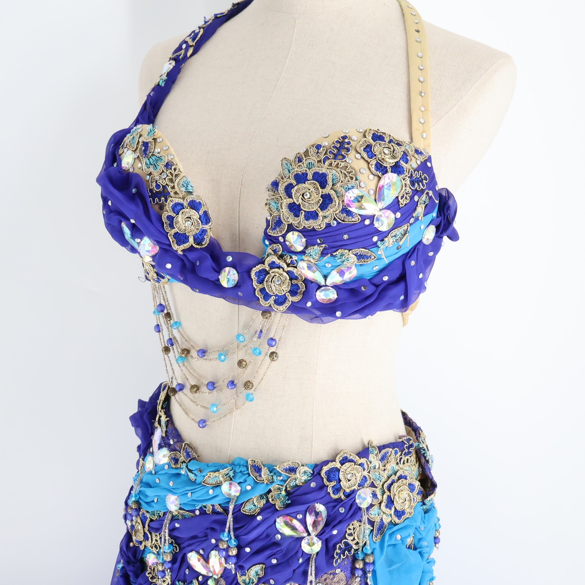#ベリーダンス #ブルー衣装 #花柄刺繍 #ゴールド装飾 #シルバーアクセント #フリルデザイン #レース生地 #ラインストーン #透け感 #エレガントスタイル #爽やかデザイン #ブラトップ #スカートセット #豪華衣装 #華やか #女性らしい #特別なパフォーマンス #ステージ衣装 #ダンスファッション #個性的デザイン #ダンス衣装 #ダンスコスチューム #古着 #中古 #ENUTSU