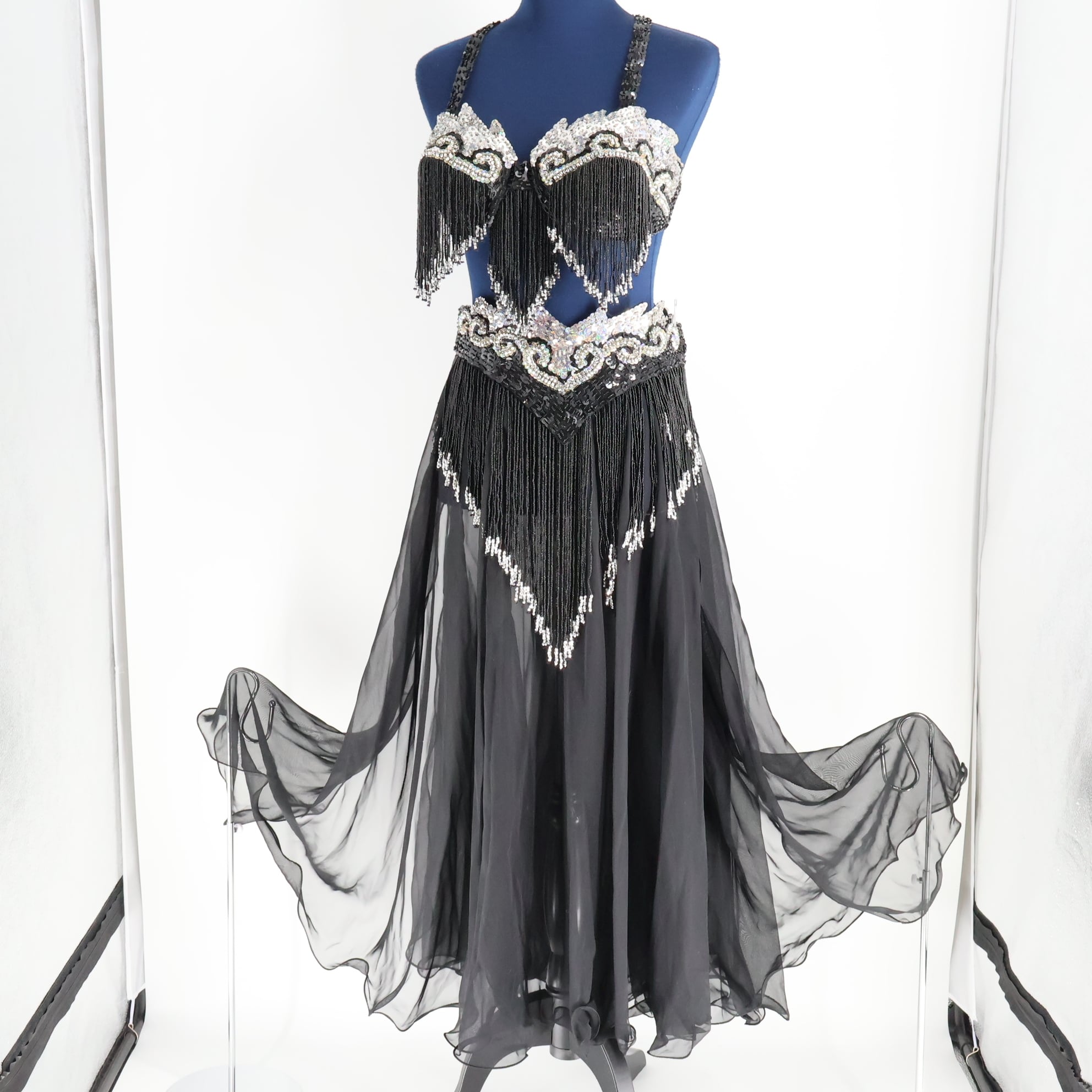 #ベリーダンス #オリエンタル衣装 #ブラックドレス #シルバー装飾 #スパンコール #ラメ素材 #レース生地 #豪華衣装 #ブラトップ #ベルトセット #スカートスタイル #エレガント #ステージ衣装 #パフォーマンス用 #個性的デザイン #ダンスファッション #特別なイベント #煌びやかコスチューム #重量感 #華やかデザイン #ダンス衣装 #ダンスコスチューム #ステージ衣装 #古着 #中古 #ENUTSU