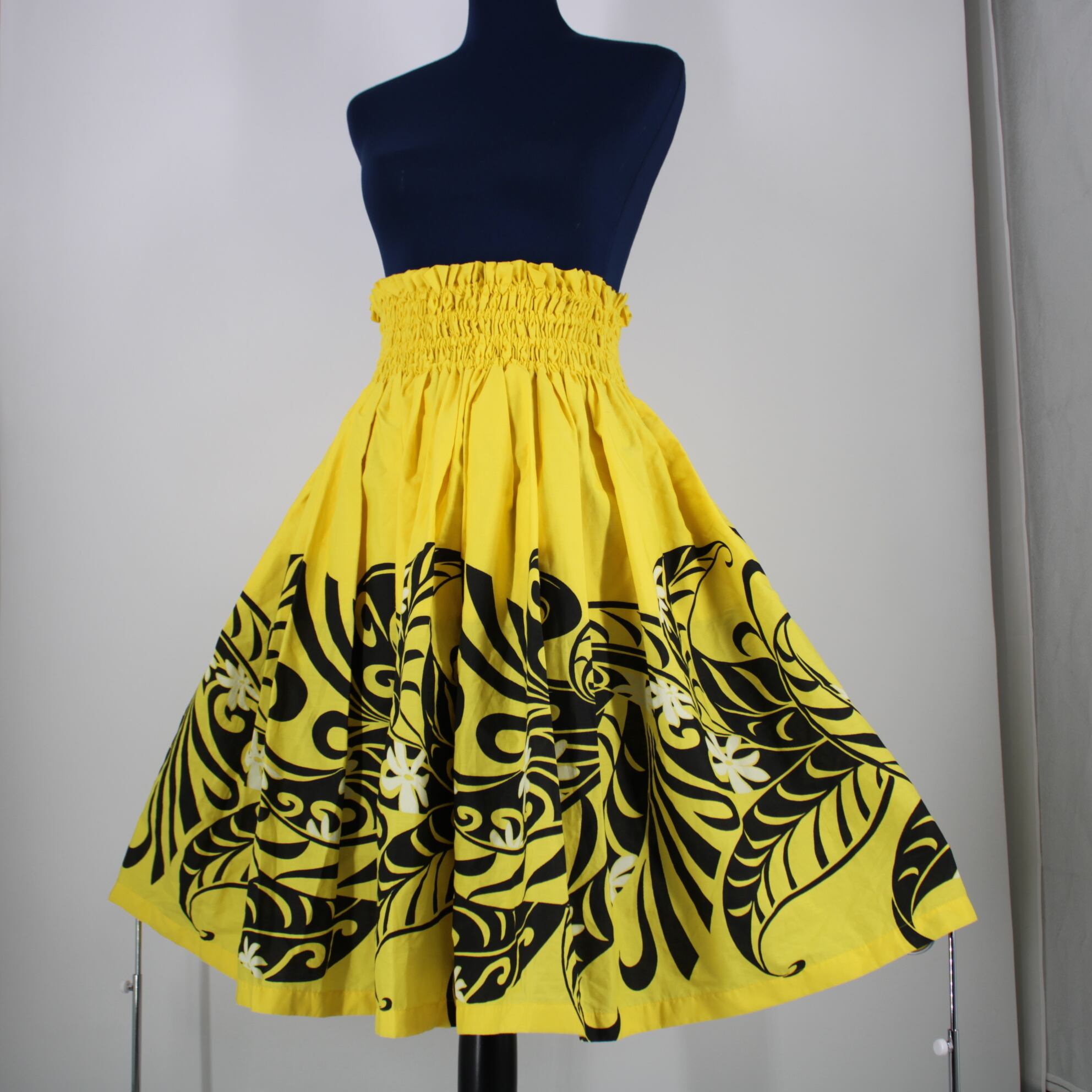 【日本製 フラダンス衣装】イエロー MMJ パウスカート ティアレ柄 黄 ブラック ホワイト 鮮やか 黒 白 ハワイアン アロハ 花柄