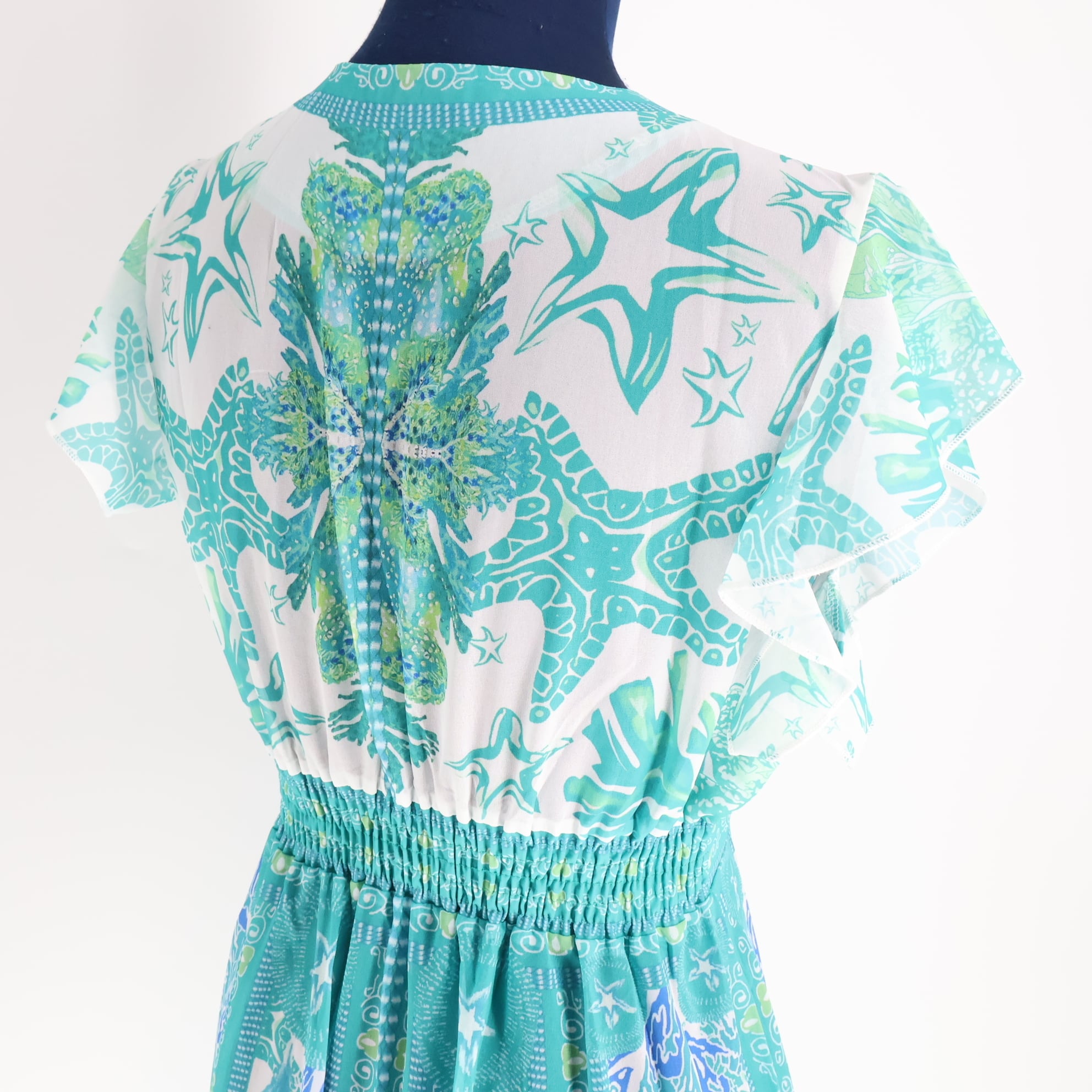 【ベリーダンス用衣装】青緑 solana belly ワンピースドレス ガラベーヤ マリン柄 水色 白 ボタン レース生地 爽やか 可愛い