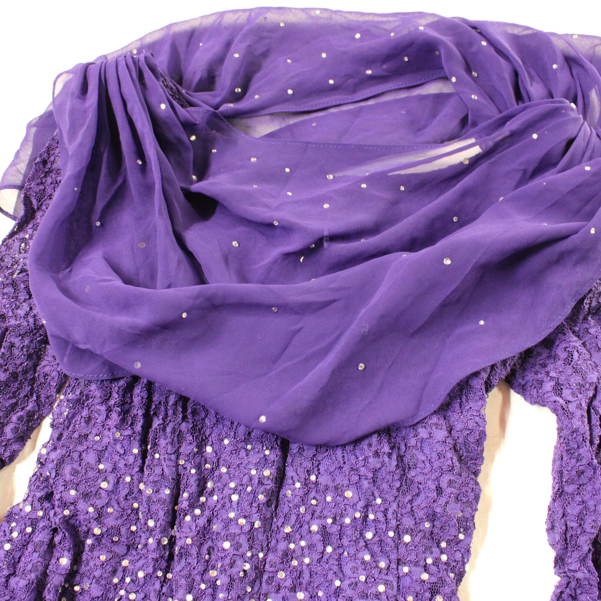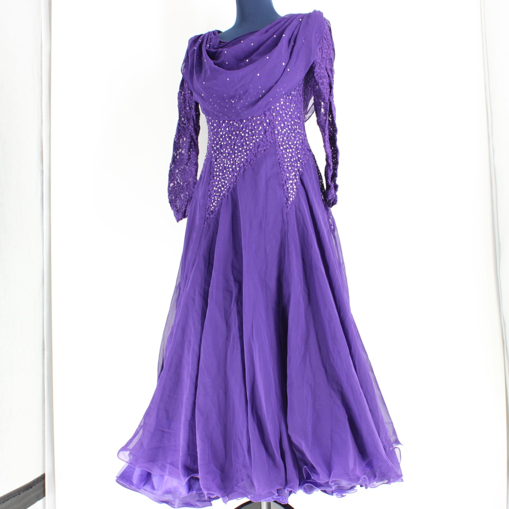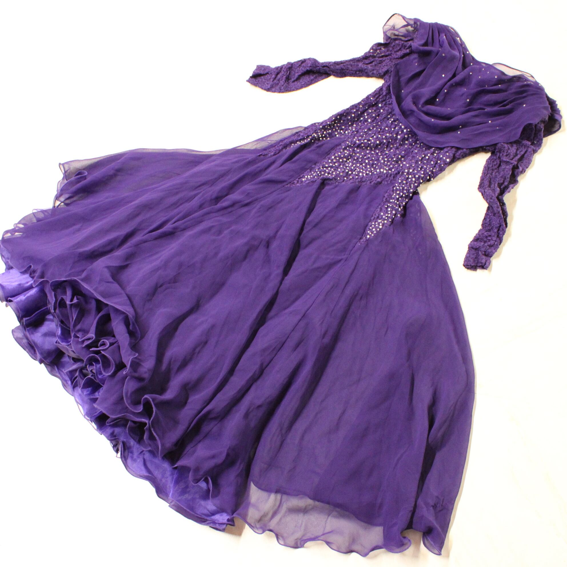 【美品 社交ダンス衣装】ワンピース ドレス 紫 パープル ラインストーン レース ドレープ 豪華 ゴージャス 華やか かわいい