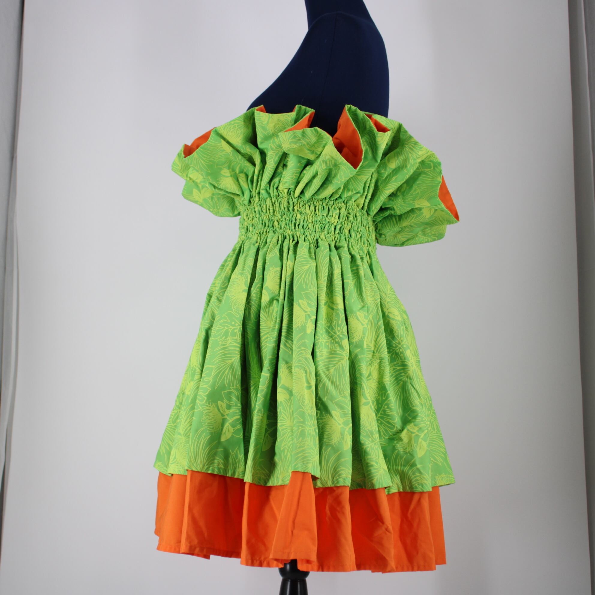【美品 フラダンス衣装】ライトグリーン パウスカート オレンジ 黄緑 絞り シャーリング モンステラ柄 緑 ハワイアン アロハ
