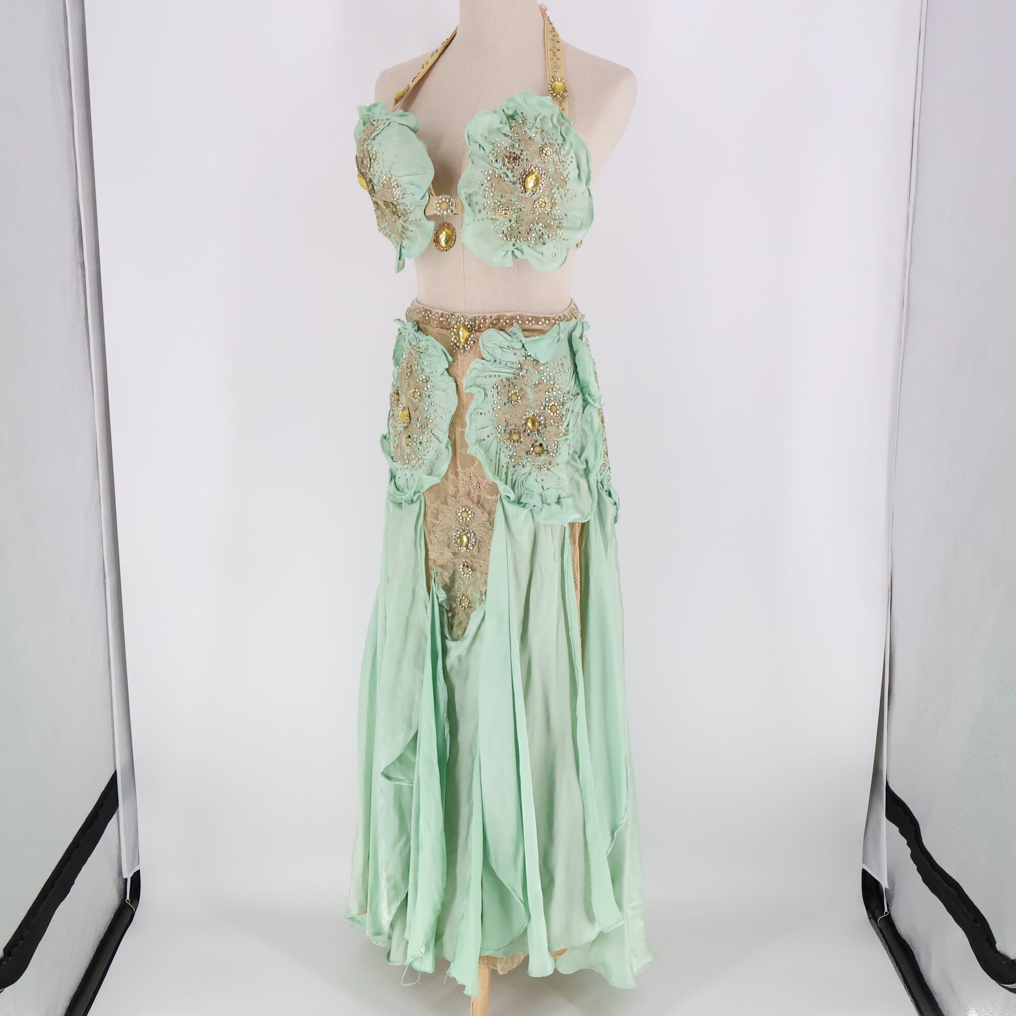 #ベリーダンス衣装 #オリエンタルスタイル #豪華刺繍 #ラインストーン装飾 #薄緑カラー #パステルファッション #フリルデザイン #レースディテール #ゴールドアクセント #エレガント衣装 #ダンスコスチューム #爽やかスタイル #インナーショーツ付き #ブラトップ&スカート #アクセサリーセット #特別なイベント用 #ステージ衣装 #舞台映えデザイン #女性らしい衣装 #ダンスファッション #ダンス衣装 #ダンスコスチューム #ステージ衣装 #古着 #中古 #ENUTSU