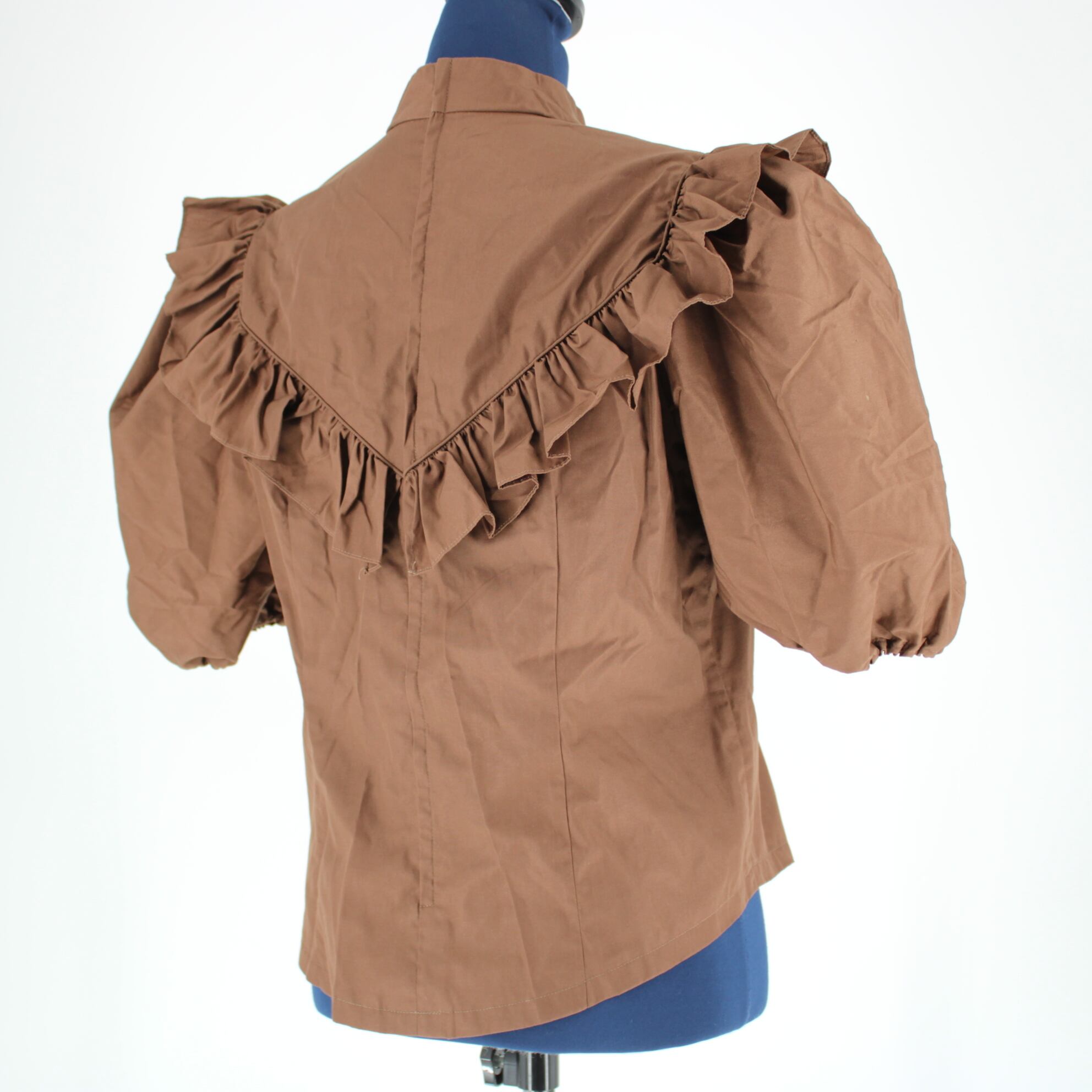 【美品 フラダンス衣装】ブラウン MENEHUNE PLANTETION メネフネプランテーション トップス ブラウス フリル 無地 茶 シンプル
