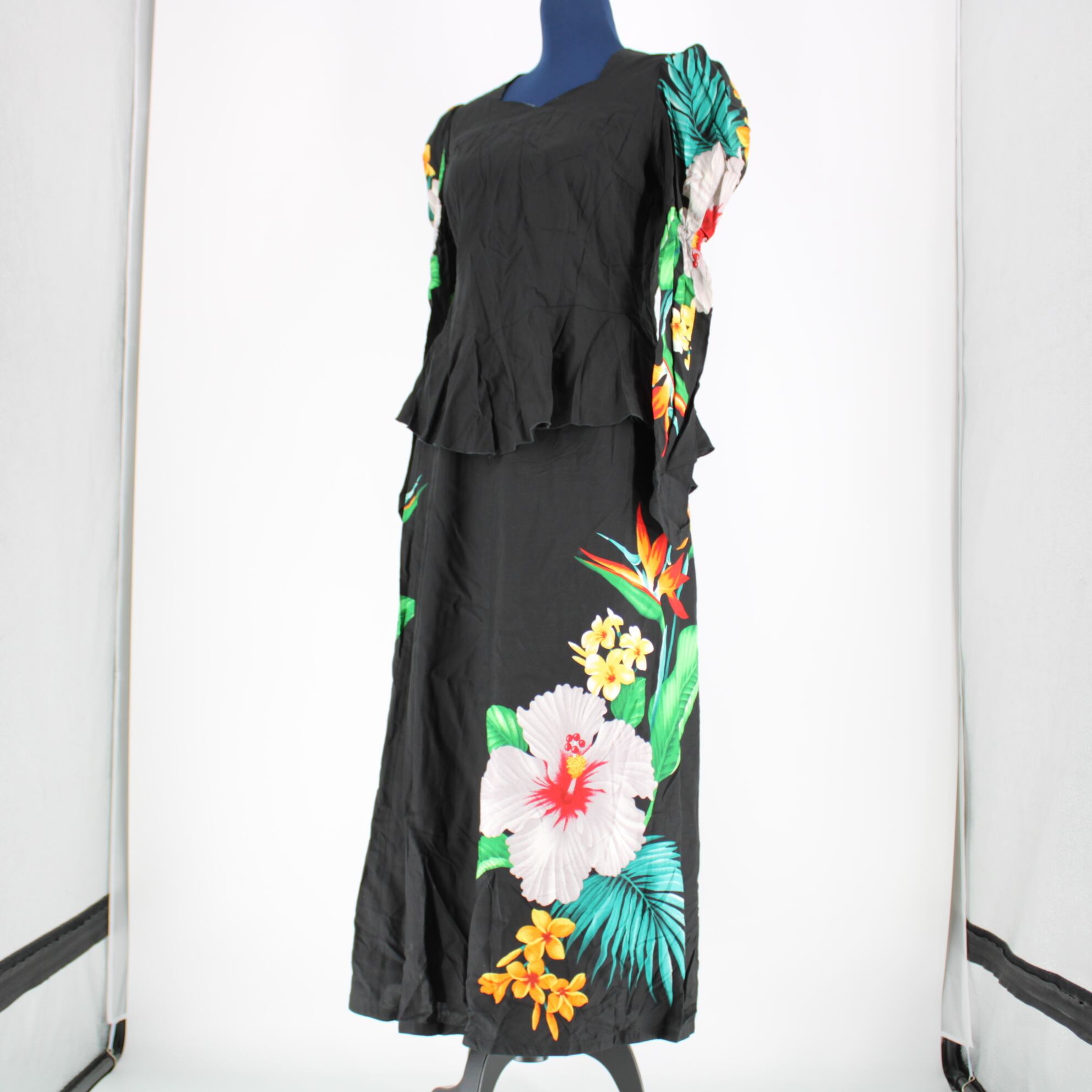 【フラダンス衣装】ブラック 上下セット ツーピース セットアップ 黒 ハイビスカス柄 長袖 インナー 鮮やか ハワイアン アロハ