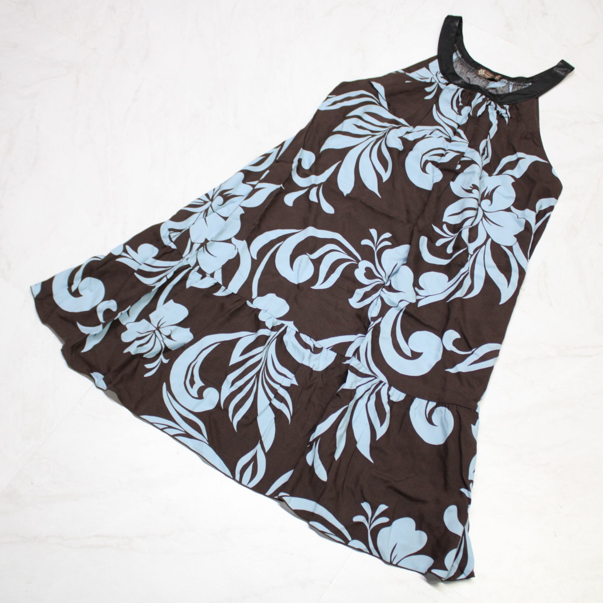 【美品 日本製 フラダンス衣装】ブラウン Mamala Bay ママラベイ ワンピース ドレス ハイビスカス柄 茶 水色 キャミソール 花