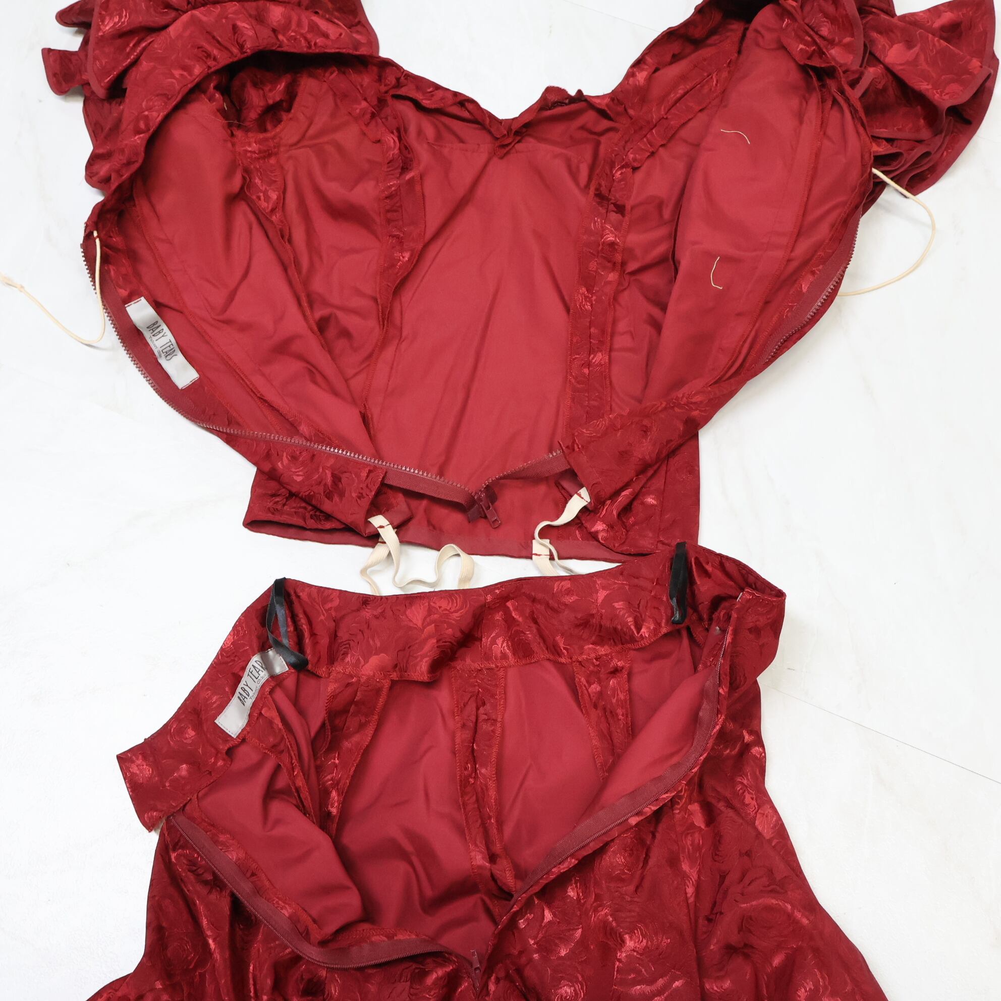 【美品 フラメンコ衣装】レッド BABY TEARS ベビーティアーズ 上下セット ツーピース ワイン 赤 ボランテ 黒 花柄 レース フリル ダンス用 レディース 発表会 ボルドー ワイン 薔薇 光沢 上品