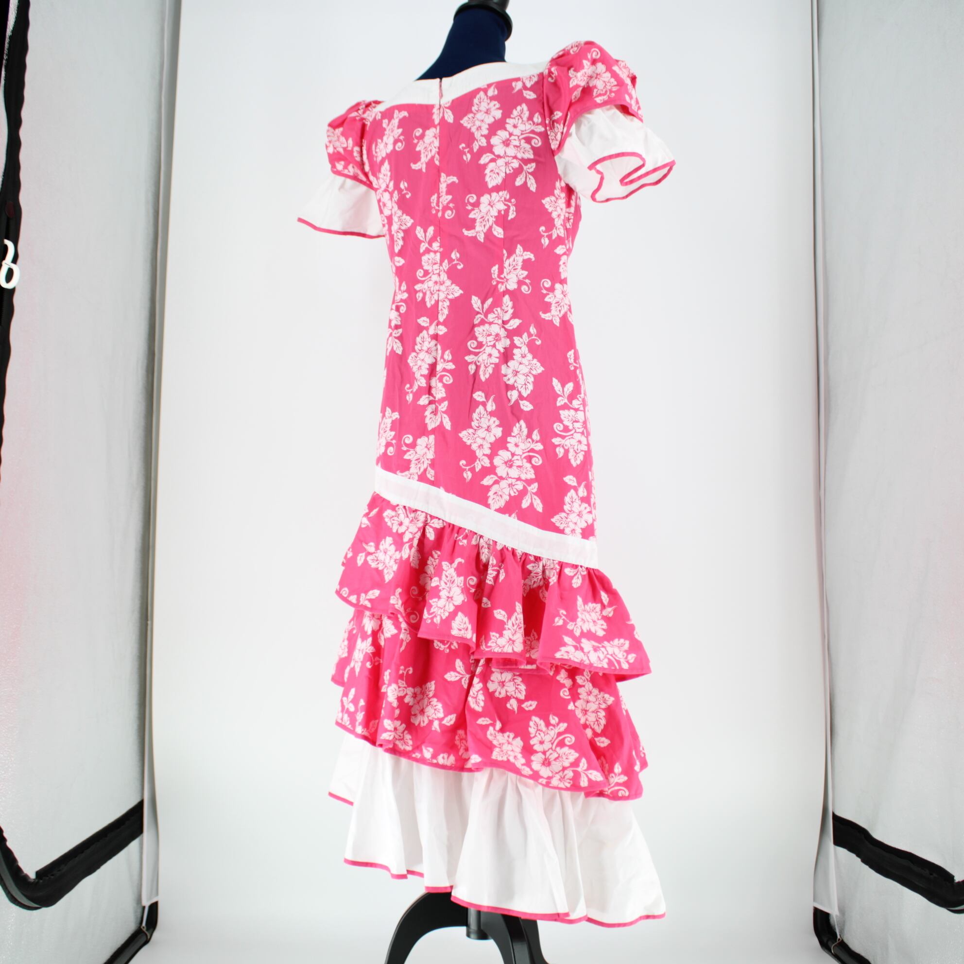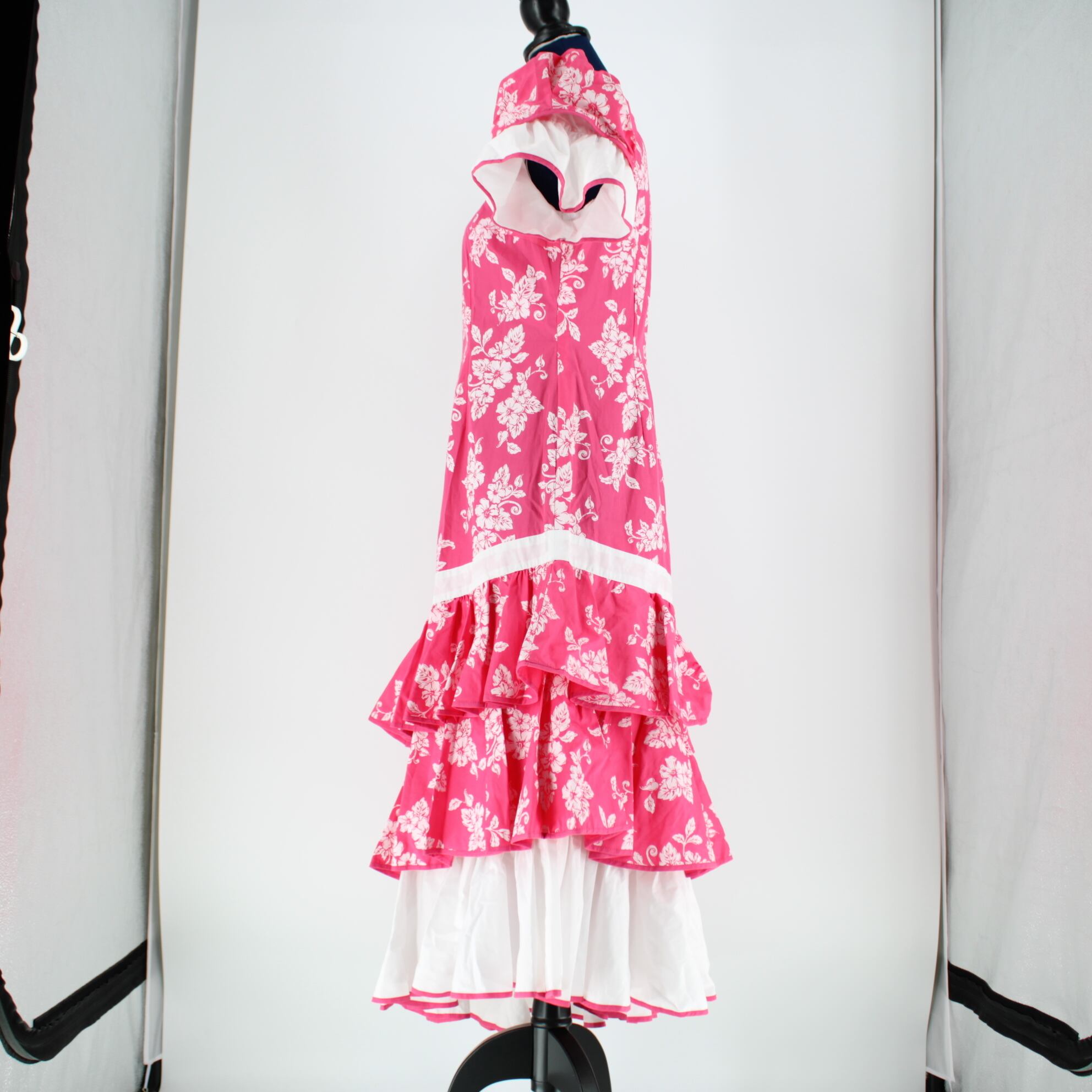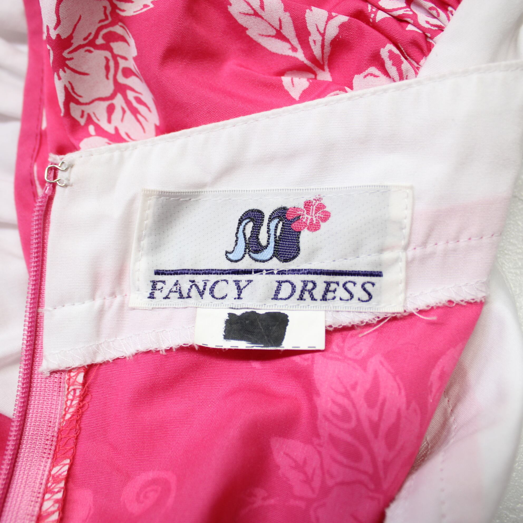 【美品 フラダンス衣装】ピンク FANCY DRESS ファンシードレス ワンピース ドレス ホワイト ハイビスカス柄 白 フリル アロハ