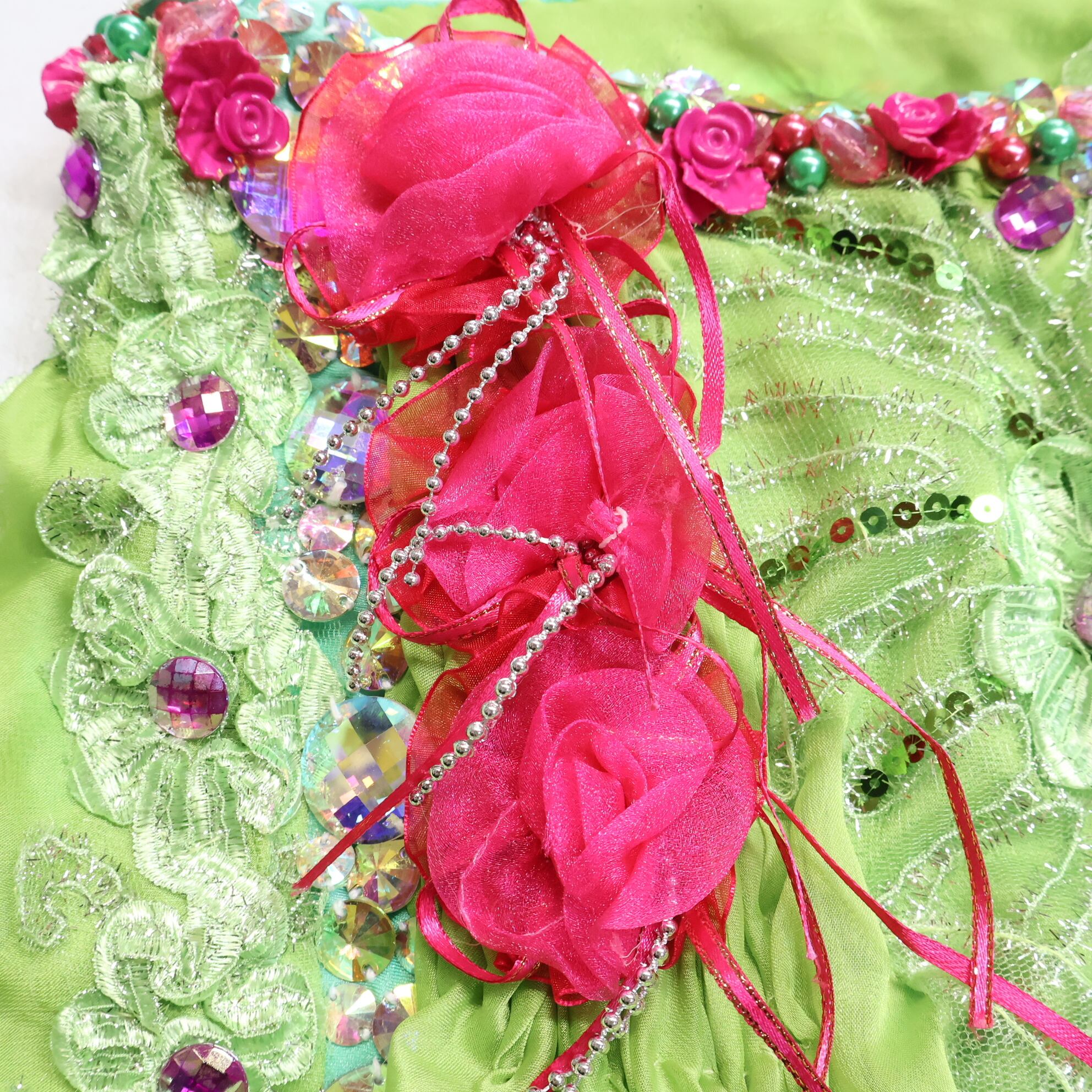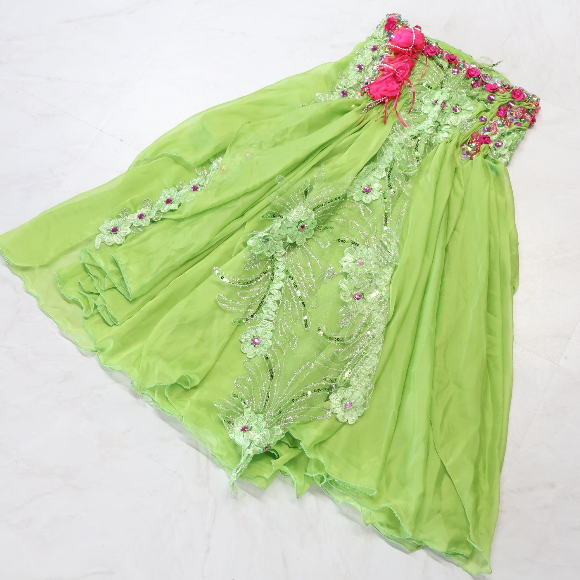 【エジプト製 ベリーダンス用オリエンタル衣装】黄緑色 Queen ラインストーン ビーズ 豪華 ピンク レース 花柄 パステルカラー ブラトップ スカートセット 鮮やか 可愛い 華やか