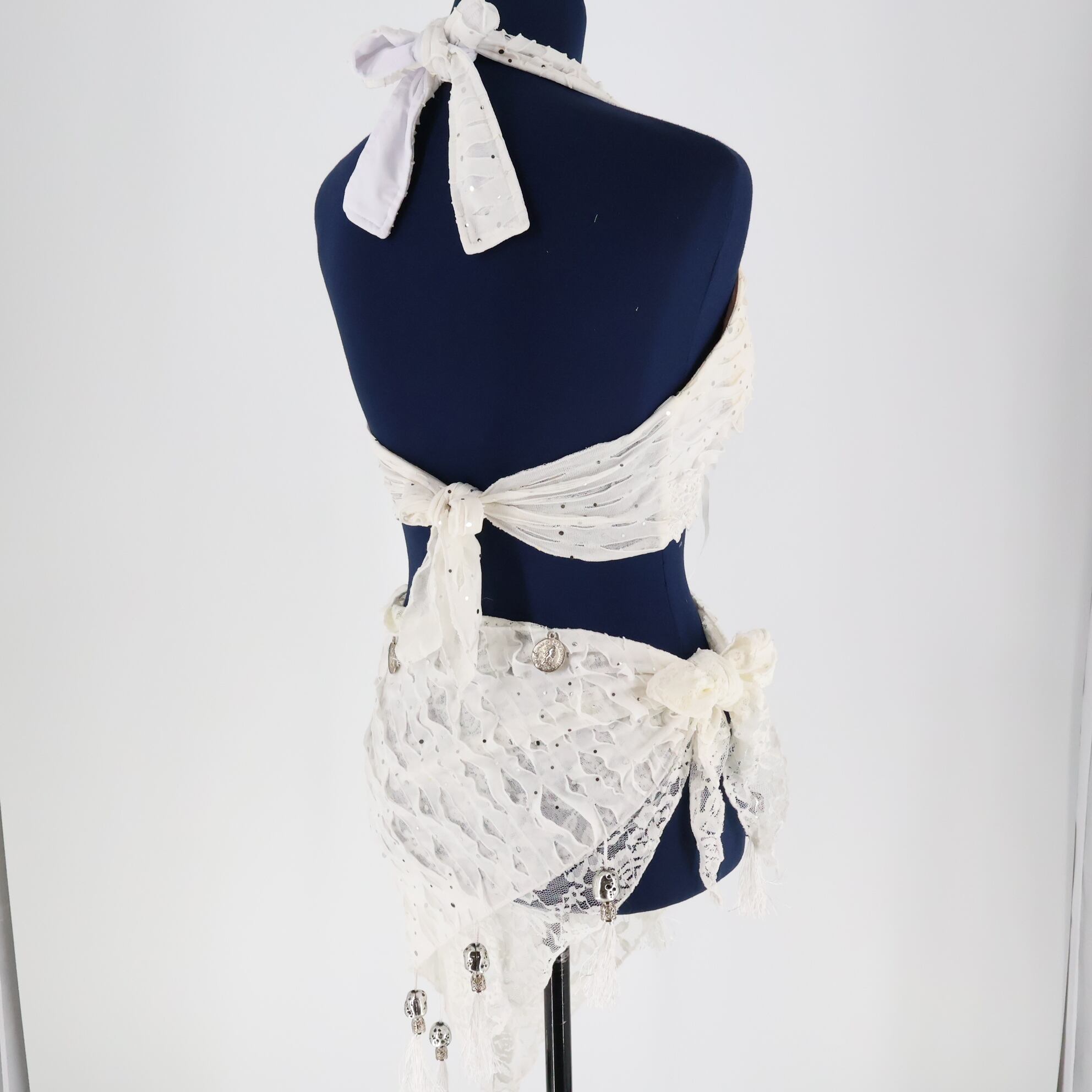 【ベリーダンス用オリエンタル衣装】ホワイト ラインストーン コイン ラメ 真っ白 シルバー レース生地 花柄 透け感 装飾