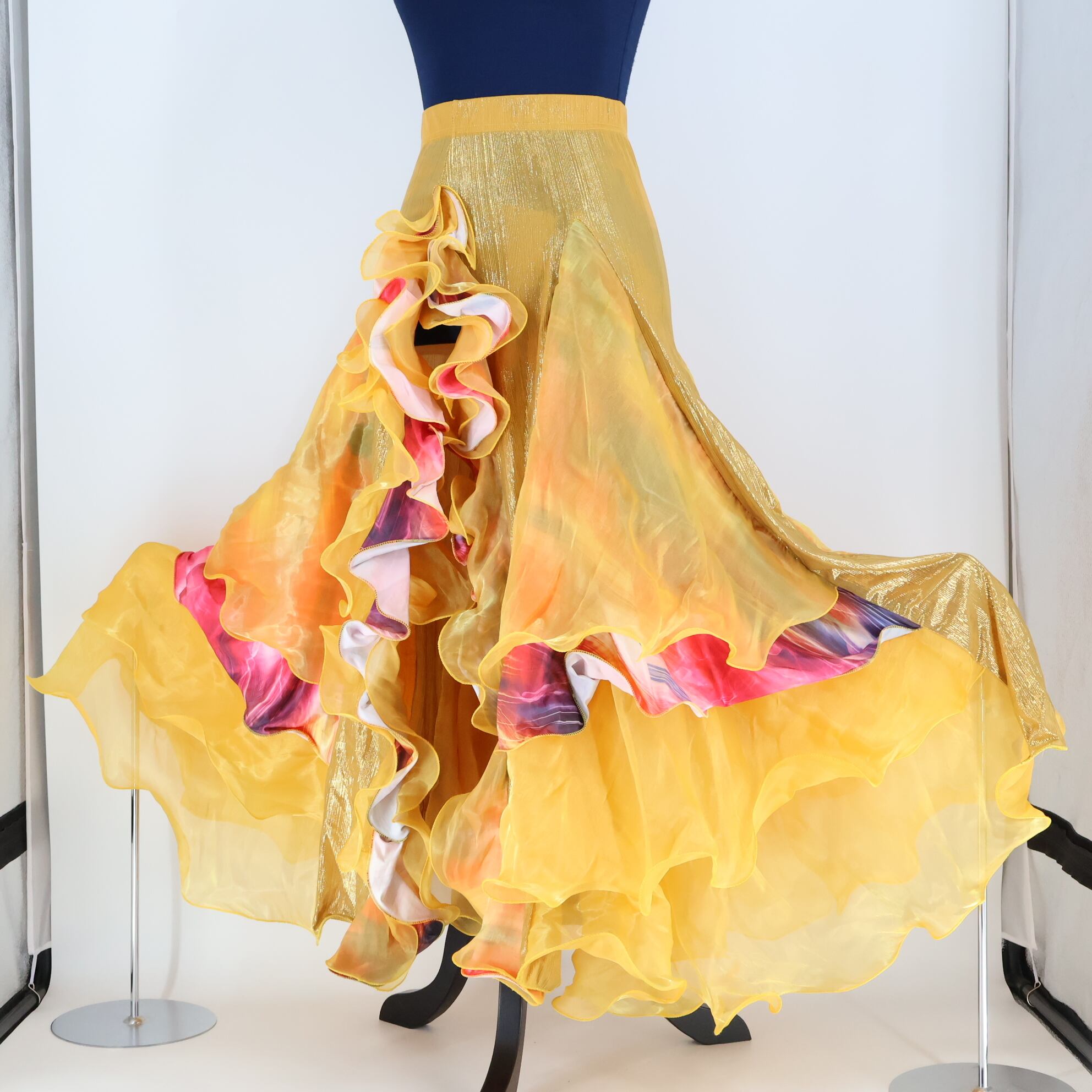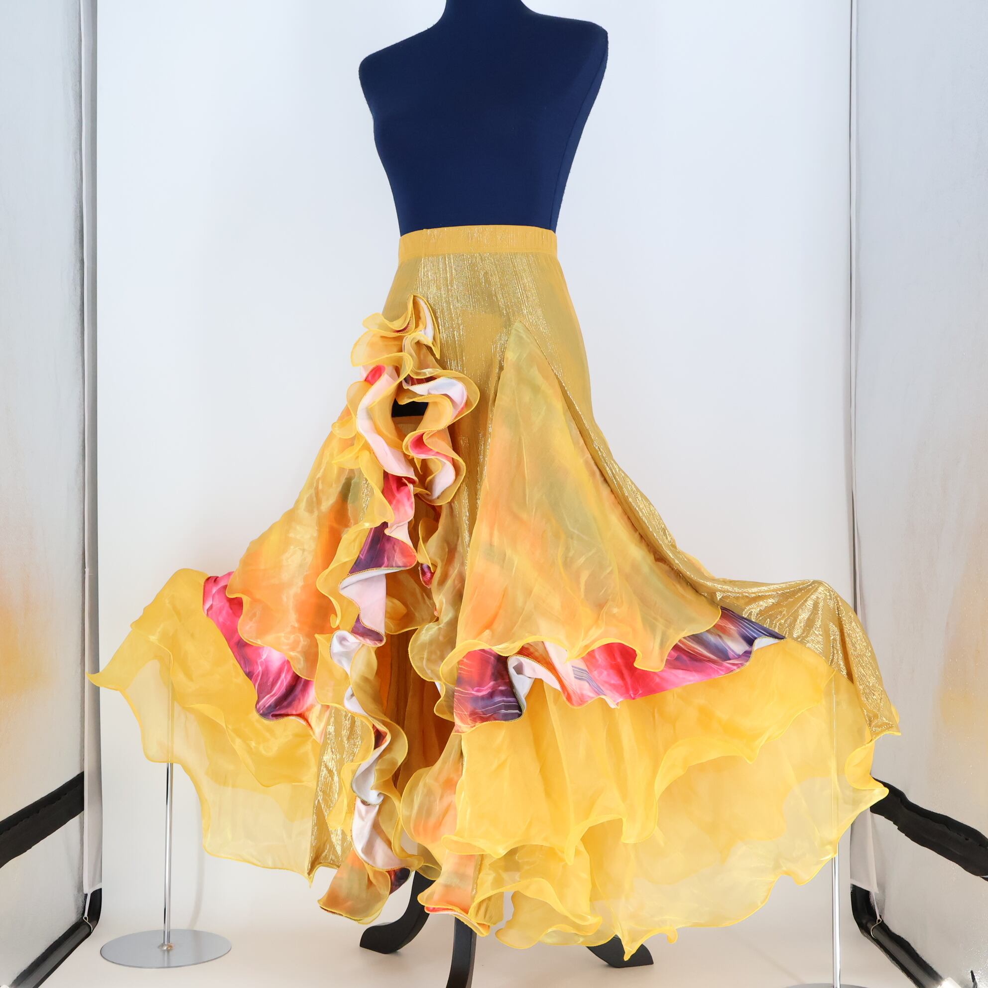 【ベリーダンス用 オリエンタル衣装】オレンジ×ゴールド スカート フリル 豪華 光沢 艶 スリット入り 女性らしい 可愛い 花柄