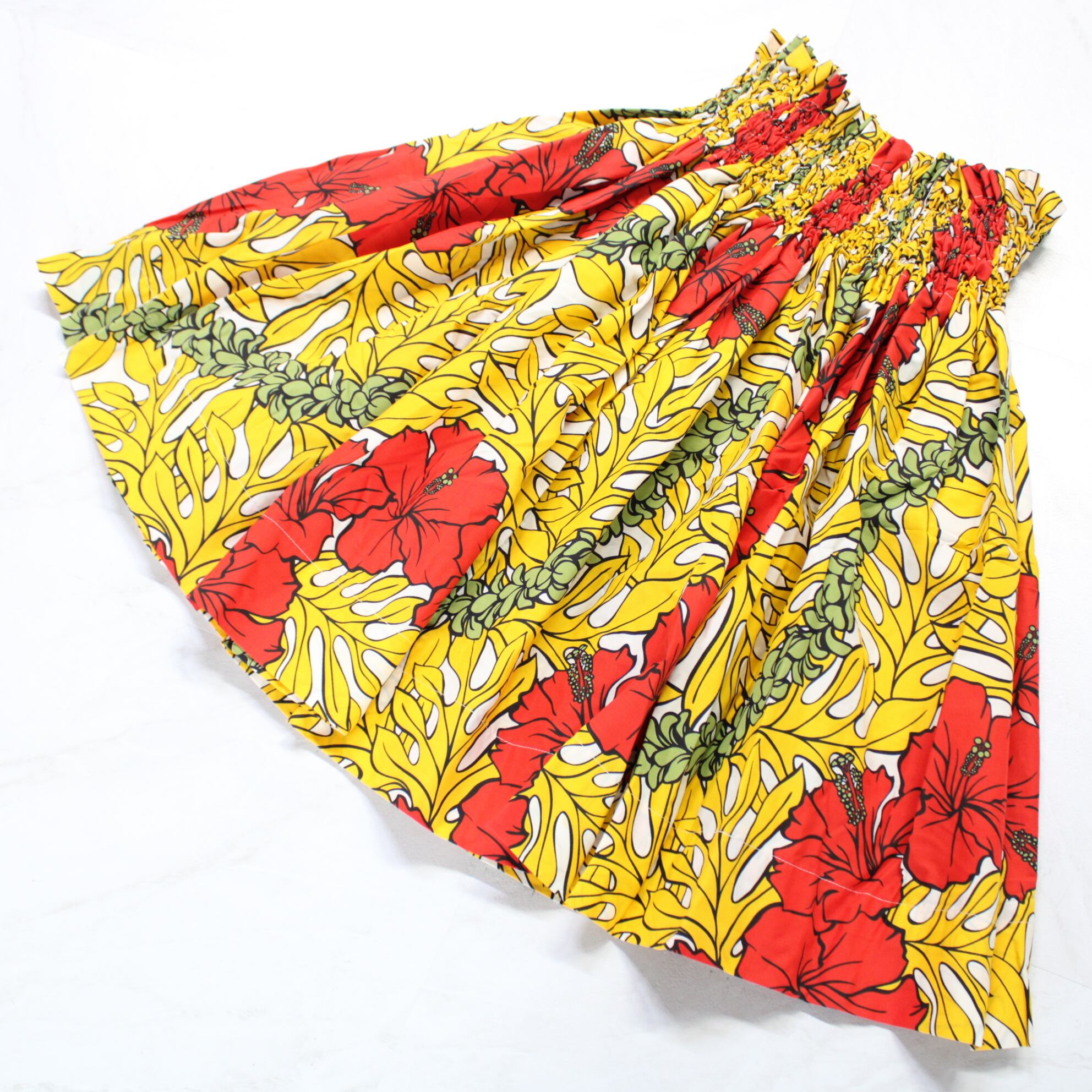 【美品 フラダンス衣装】イエロー パウスカート ハイビスカス柄 黄 レッド ホワイト カラフル 鮮やか 花柄 白 赤 ハワイアン