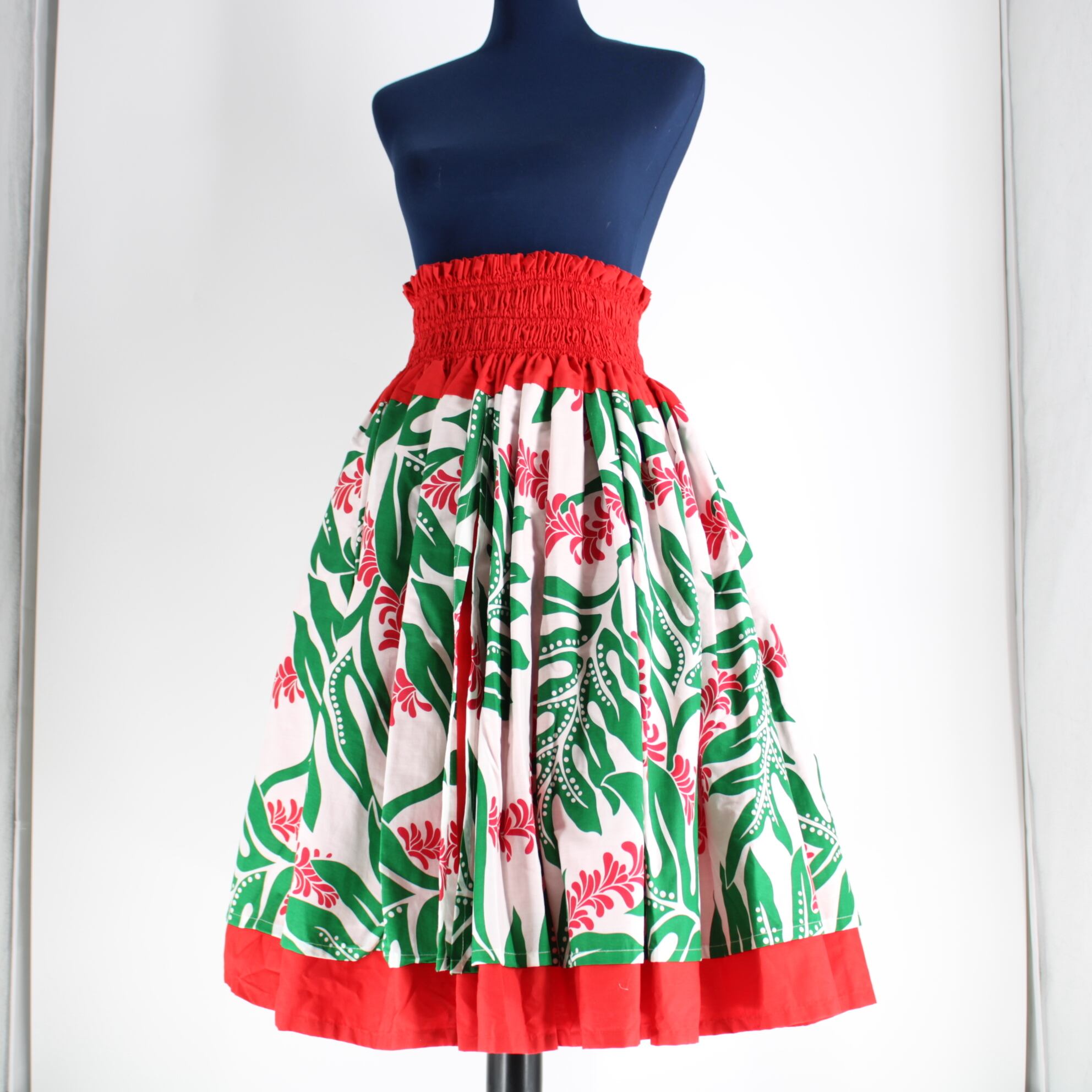 【美品 フラダンス衣装】ホワイト パウスカート レッド モンステラ柄 白 グリーン ハワイアン アロハ 赤 緑 シャーリング 花柄