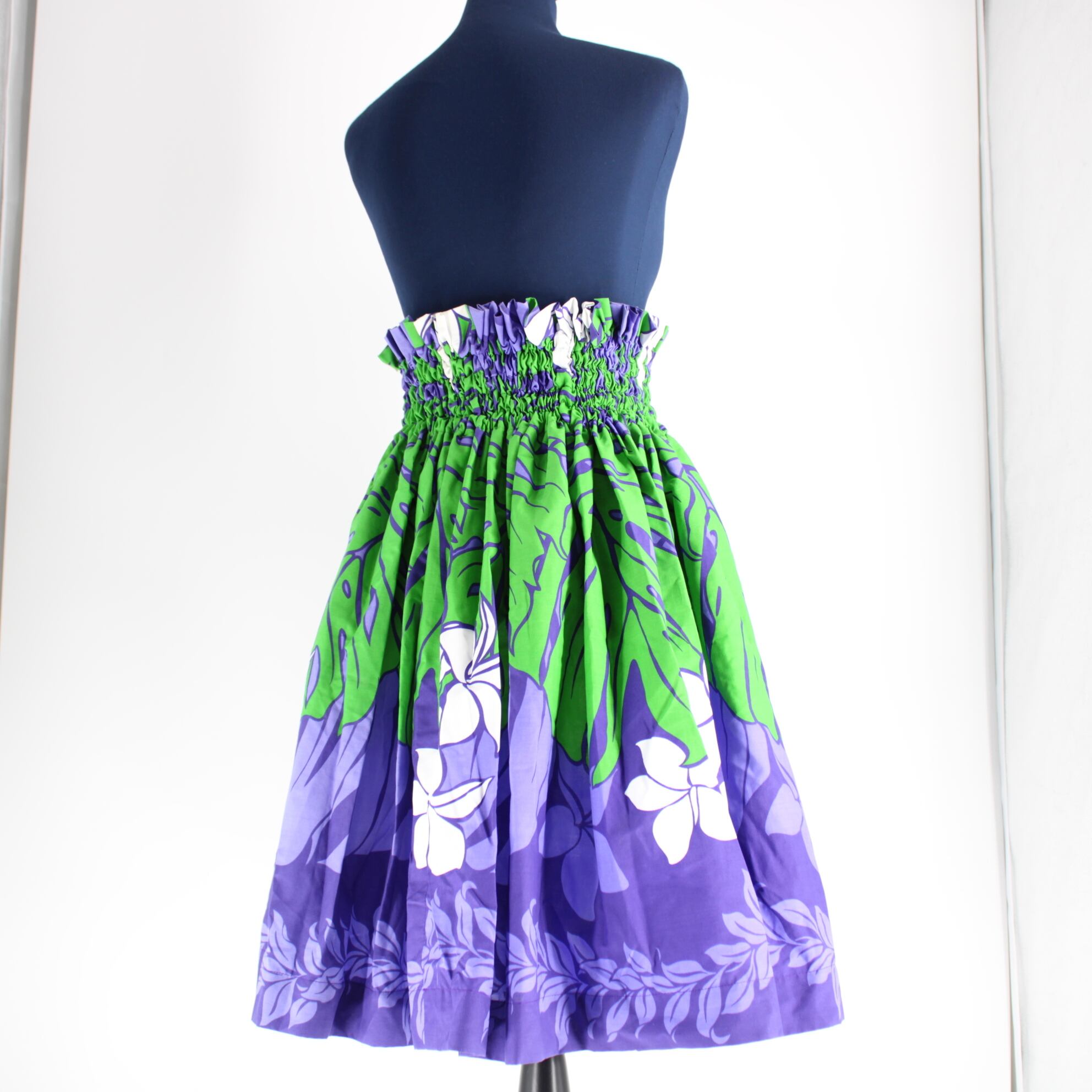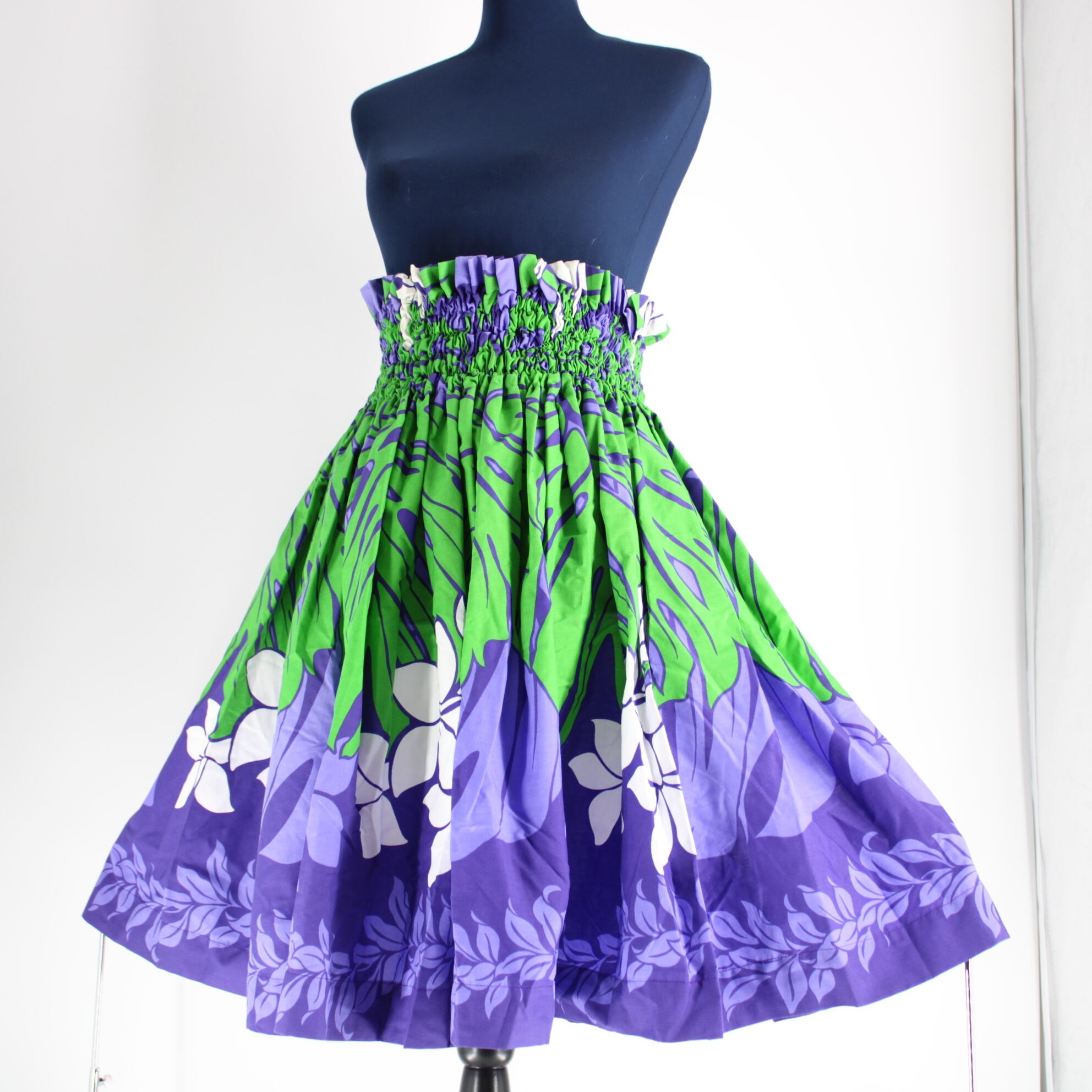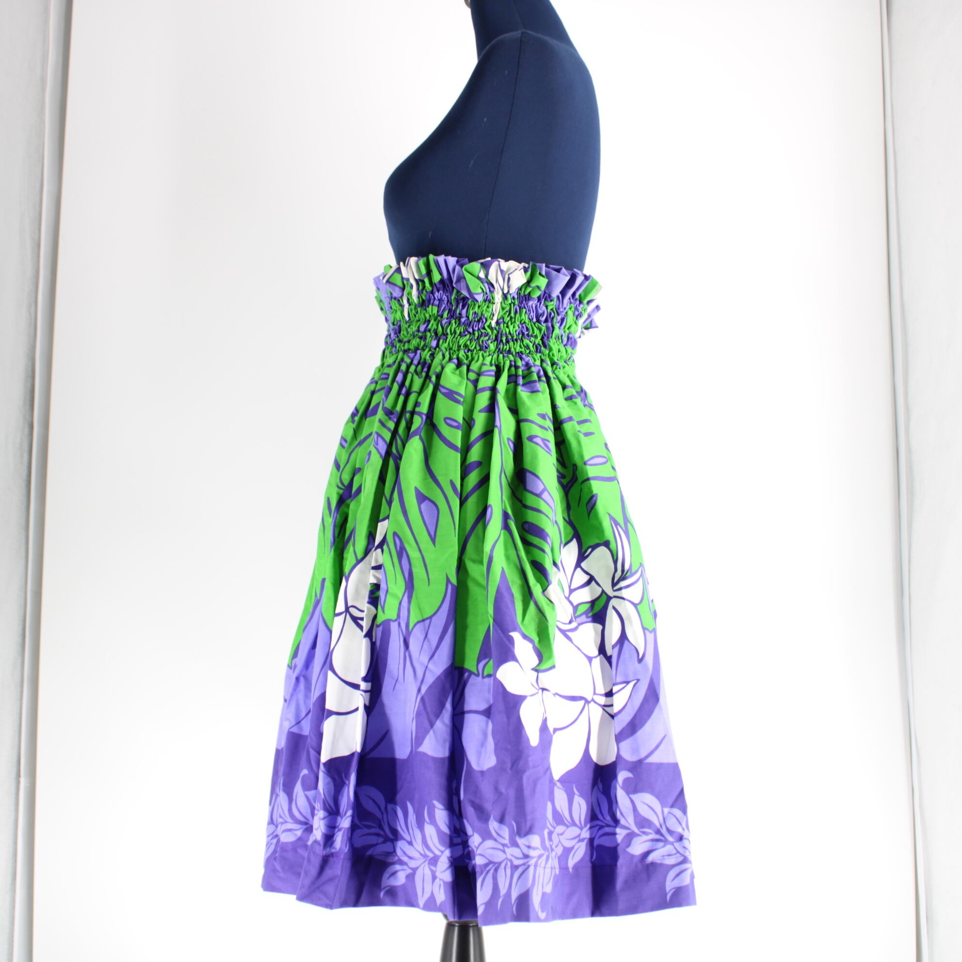【フラダンス衣装】パープル パウスカート プルメリア柄 紫 ホワイト グリーン 鮮やか 華やか ハワイアン 花柄 白 緑 かわいい