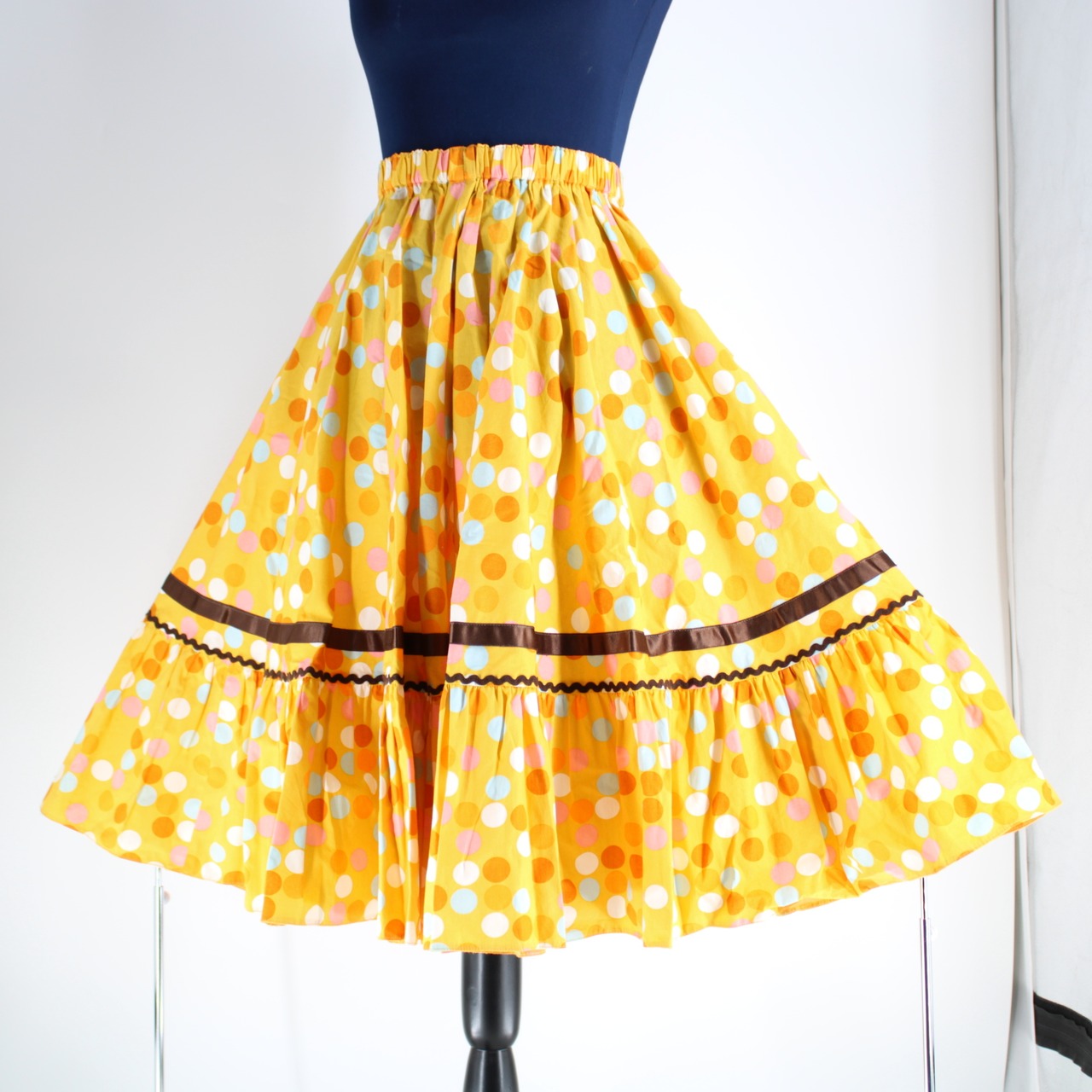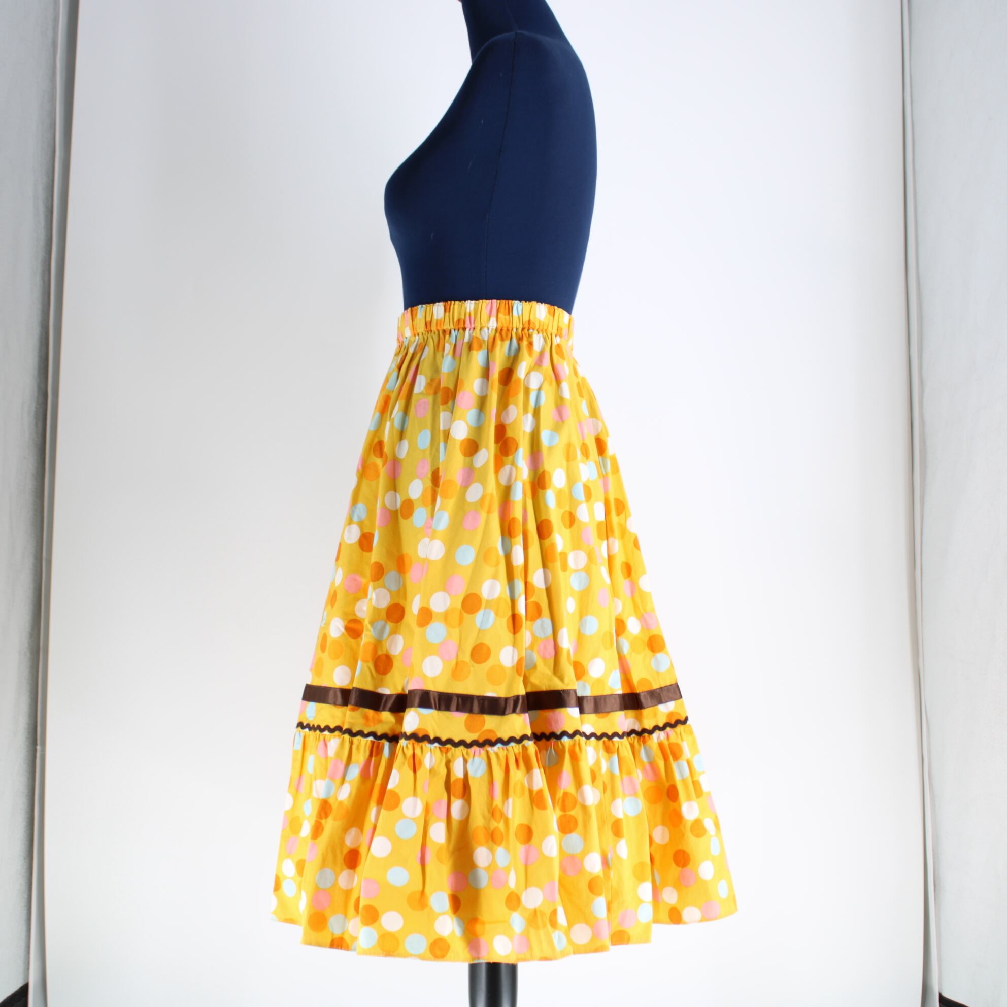 #フォークダンス #スカート #バレリーナ #イエローコーデ #カラフル #水玉模様 #リボン付き #日本製 #ポップデザイン #かわいい #ふんわりスカート #ブラウンアクセント #夏コーデ #ナチュラル #カジュアルファッション #フォークダンス衣装 #快適 #踊りやすい #明るい色合い #ダンス衣装 #ダンスコスチューム #ステージ衣装 #古着 #中古 #ENUTSU