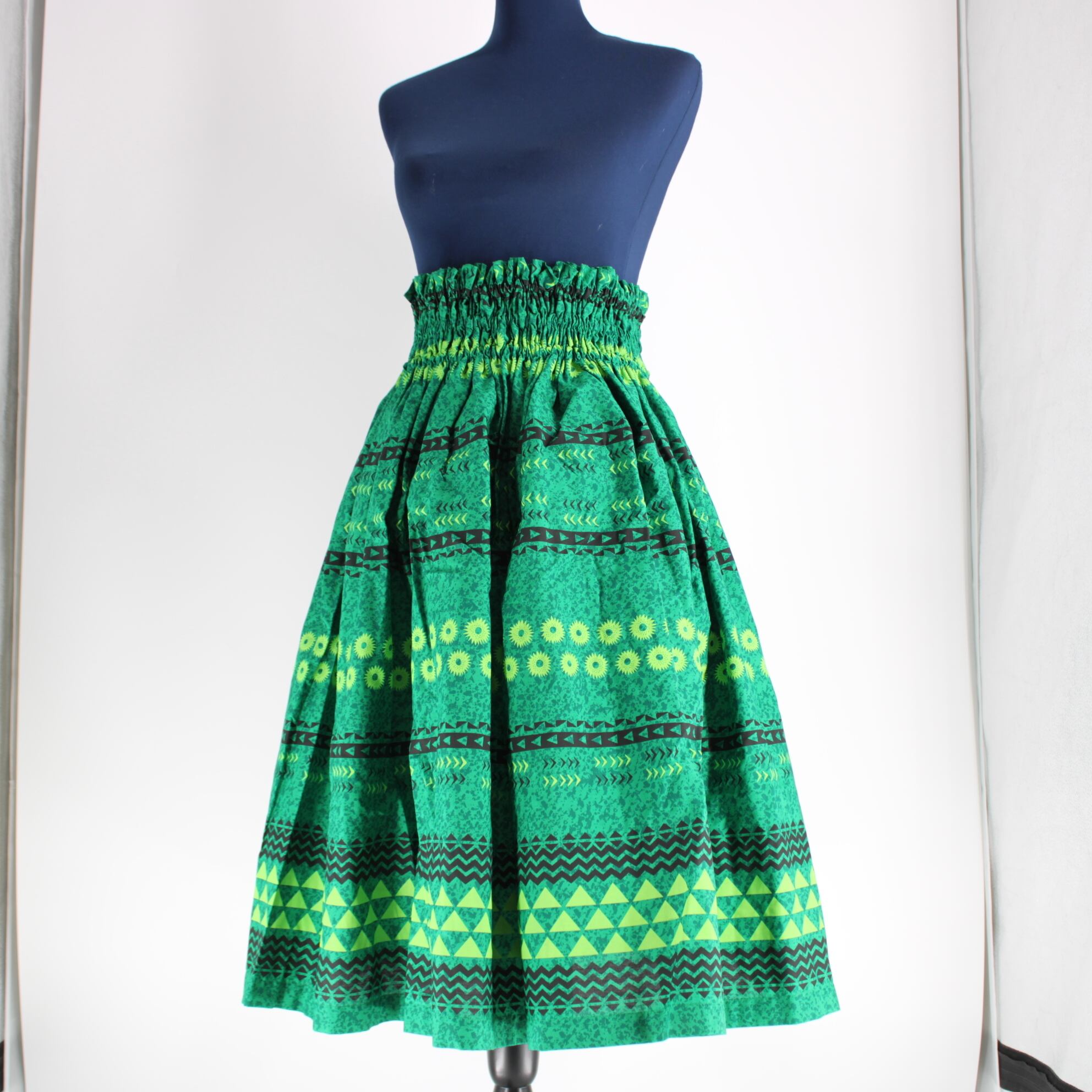 【フラダンス衣装】グリーン パウスカート 緑 ブラック ハワイアンプリント 黒 タパ柄 シャーリング アロハ フレア シングル