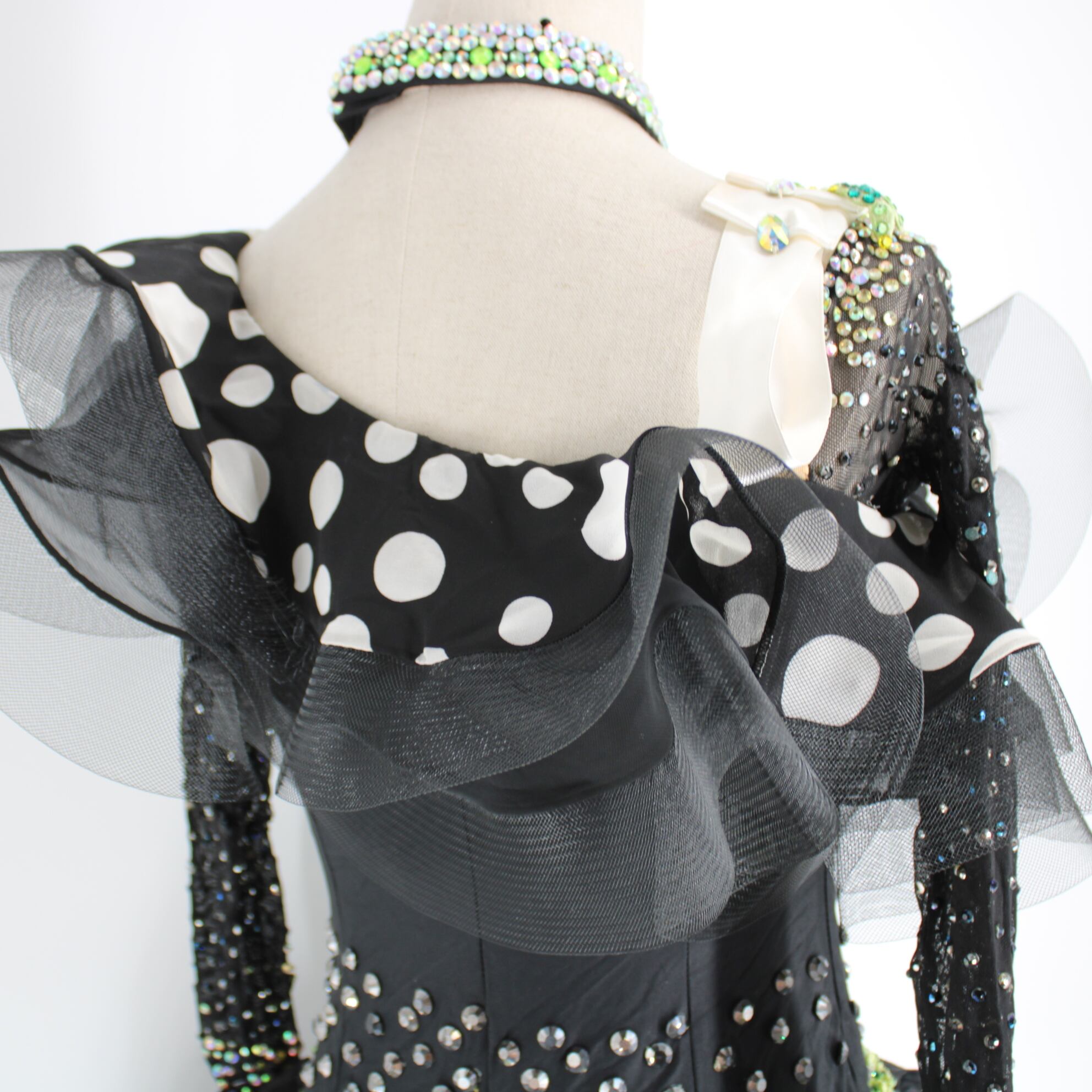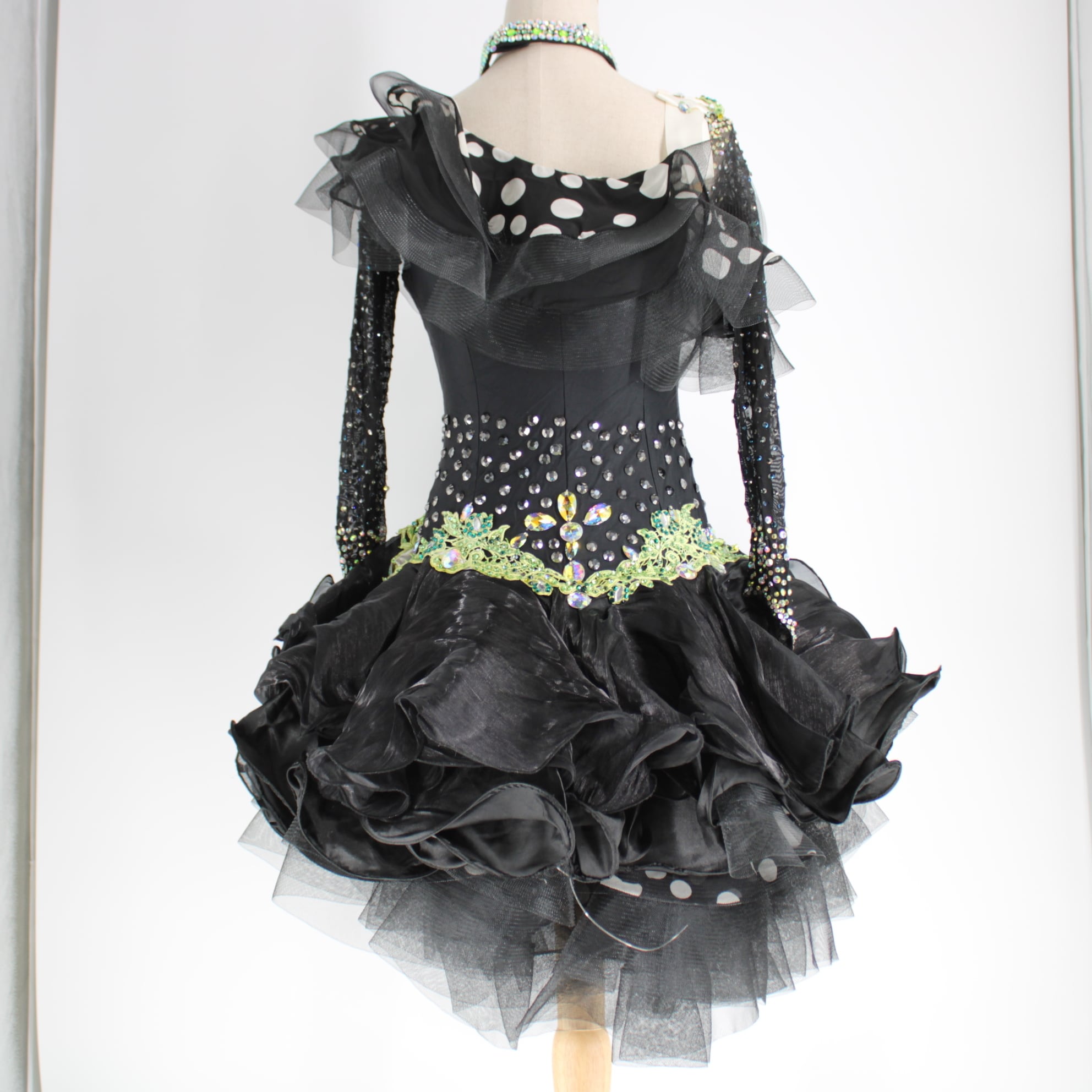#社交ダンス #ラテンドレス #ブラックドレス #フリルデザイン #水玉模様 #グリーンアクセント #長袖ドレス #かわいいスタイル #ボリューム感 #チョーカーデザイン #ビーズ装飾 #レオタード付き #クロッチ付き #発表会用 #レディースダンス #中古ドレス #美品 #ダンスファッション #ステージ衣装 #ENUTSU