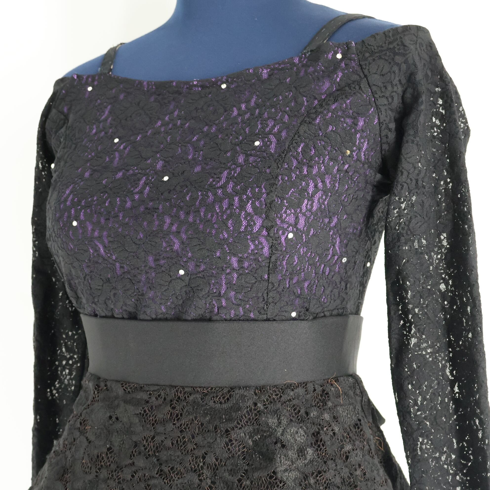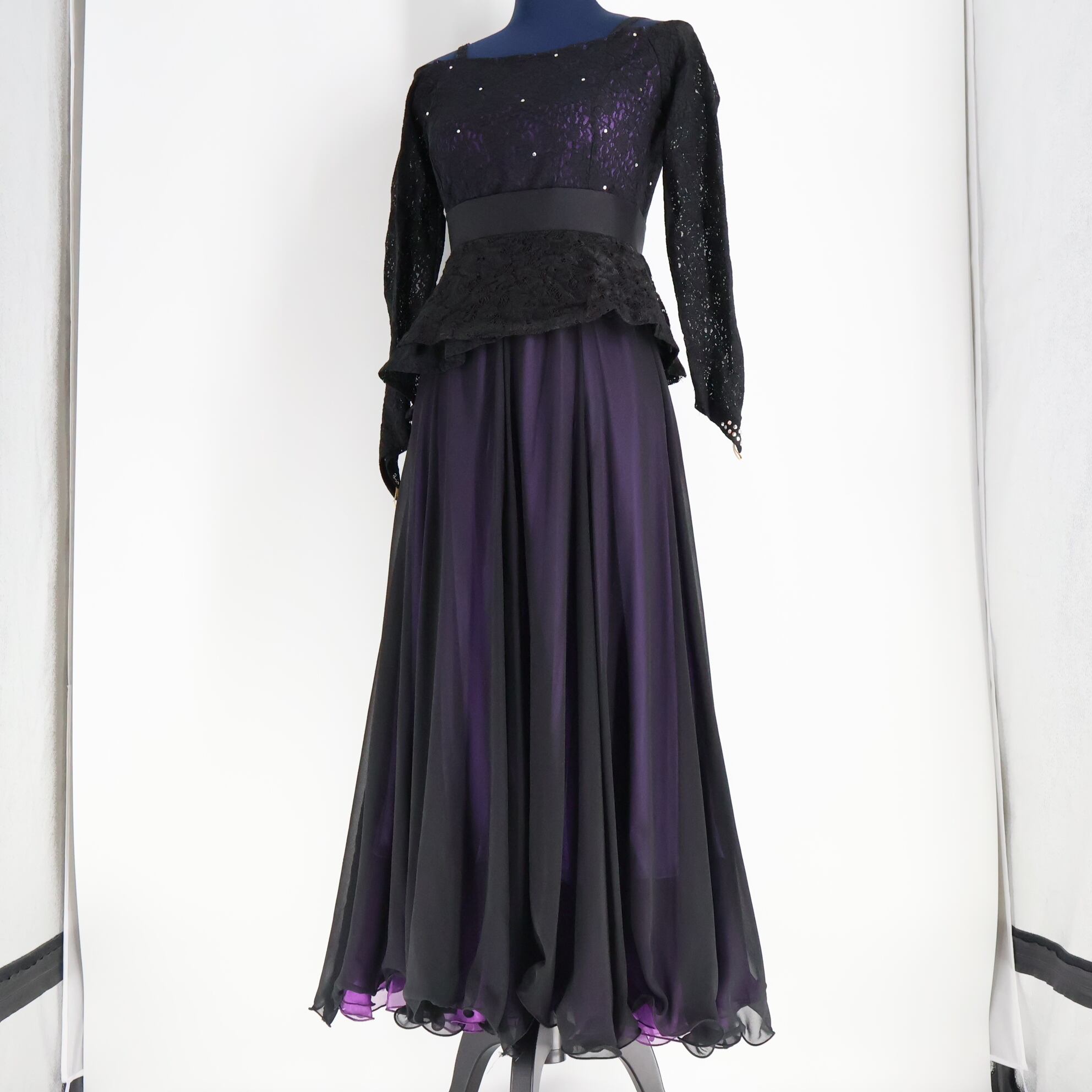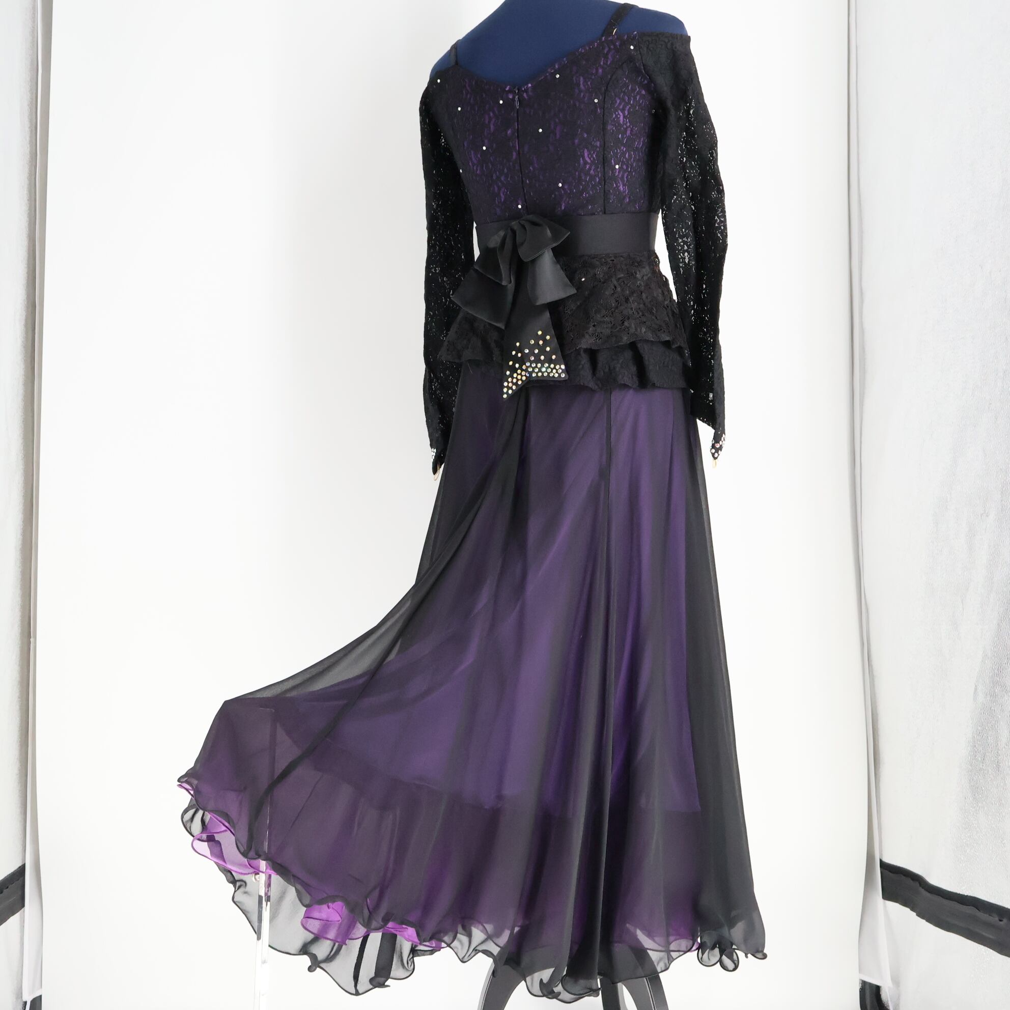 #ダンス衣装 #ダンスコスチューム #ステージ衣装 #社交ダンス #ブラックドレス #高級感 #女性らしい #レースドレス #パープルアクセント #エレガント #フリルドレス #パーティ衣装 #リボンデザイン #ドレスワンピース #中古ドレス #レイリーナ #古着 #美品 #社交ダンスドレス #ENUTSU