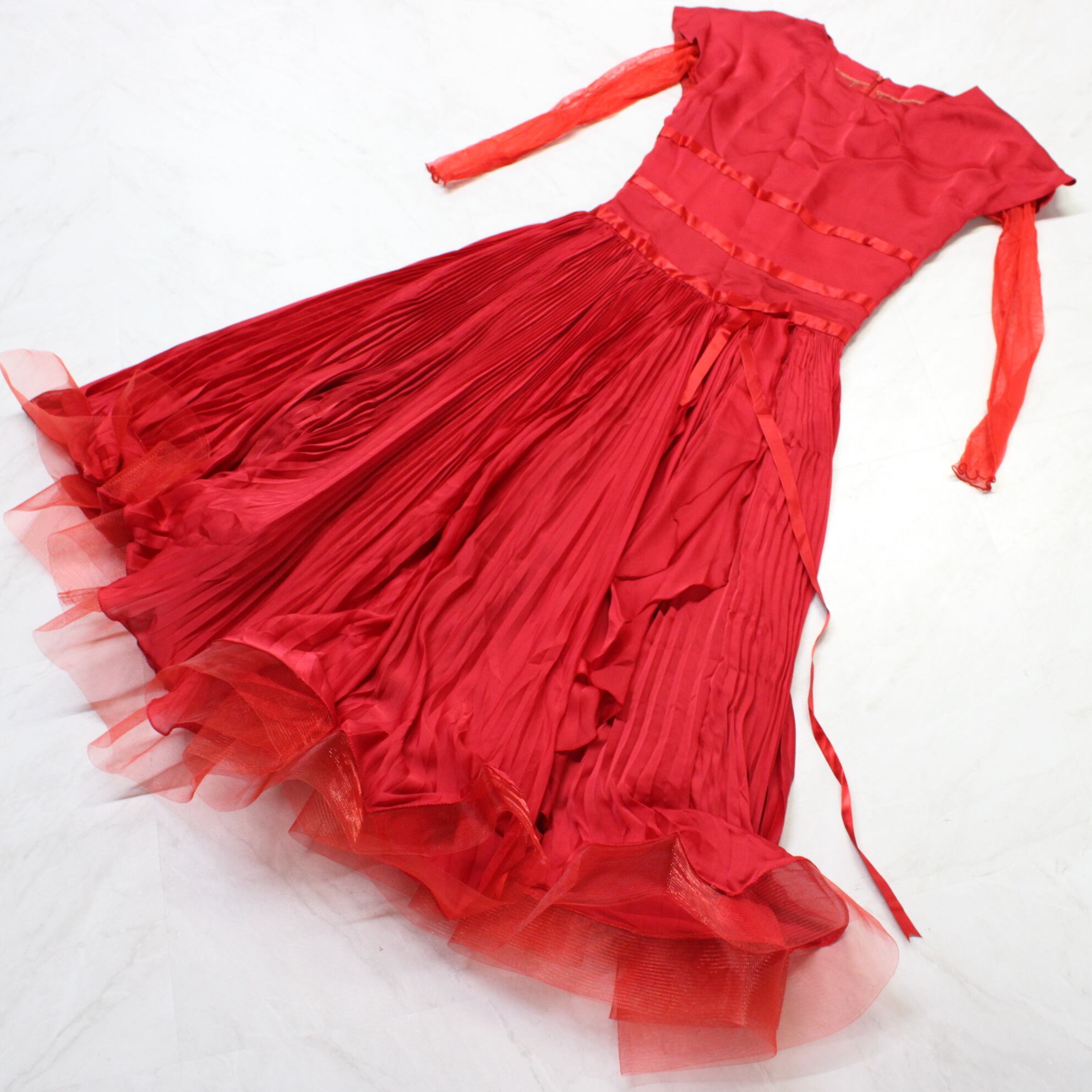 【美品 社交ダンス衣装】ワンピース ドレス 赤 レッド かわいい 可愛い 派手 目立つ 透け感 リボン フェミニン レース