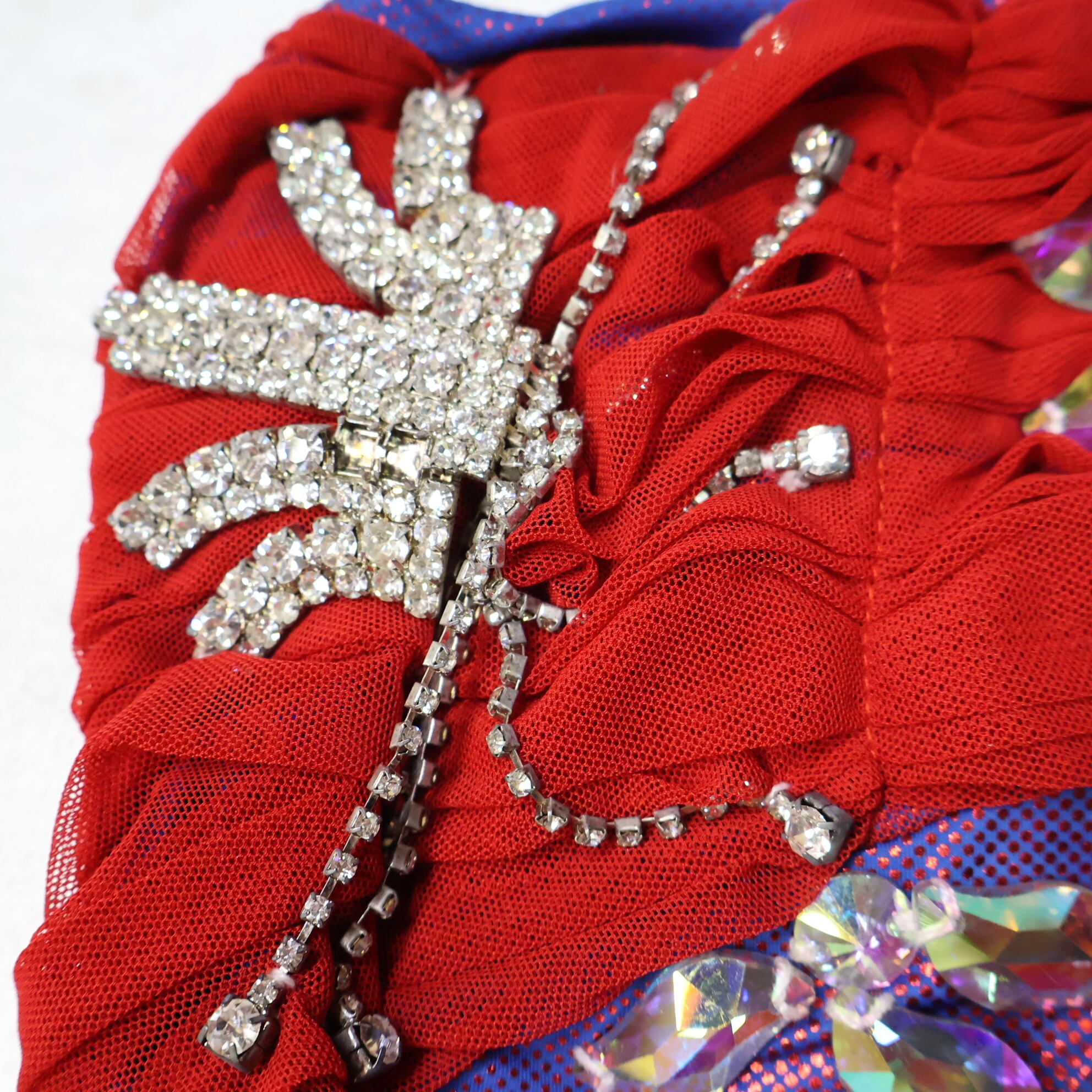 【エジプト製 ベリーダンス用オリエンタル衣装】ブルー×レッド JOHARAH ラインストーン 青 赤 シルバー 花柄 レース 光沢 ラメ お洒落 ブラトップ スカートセット スリット入り 華やか 綺麗