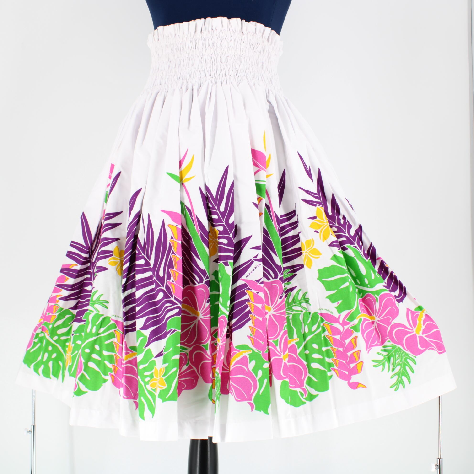 【日本製 フラダンス衣装】ホワイト MMJ エムエムジェイ パウスカート カラフル 鮮やか プルメリア柄 ピンク 緑 紫 黄 花柄 白