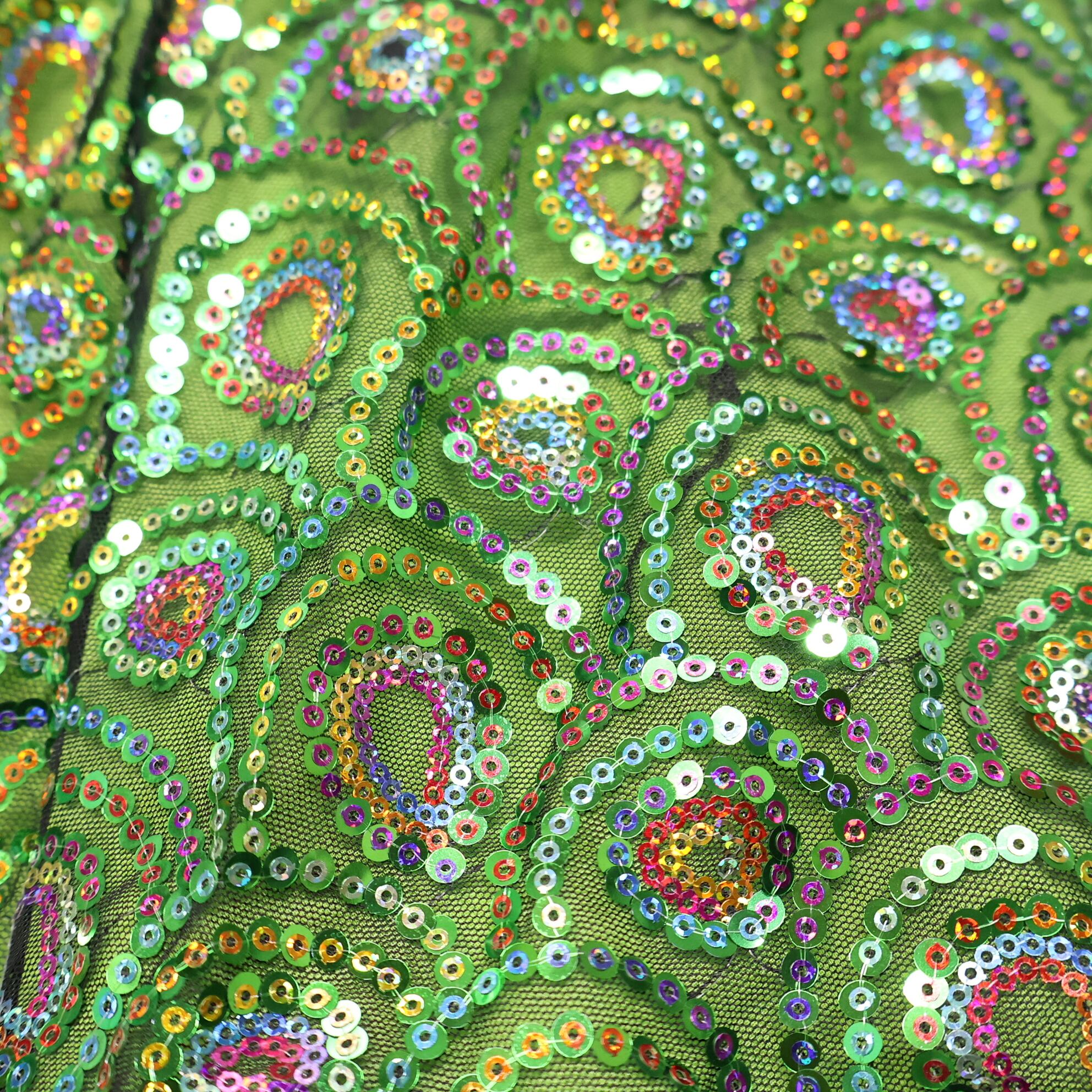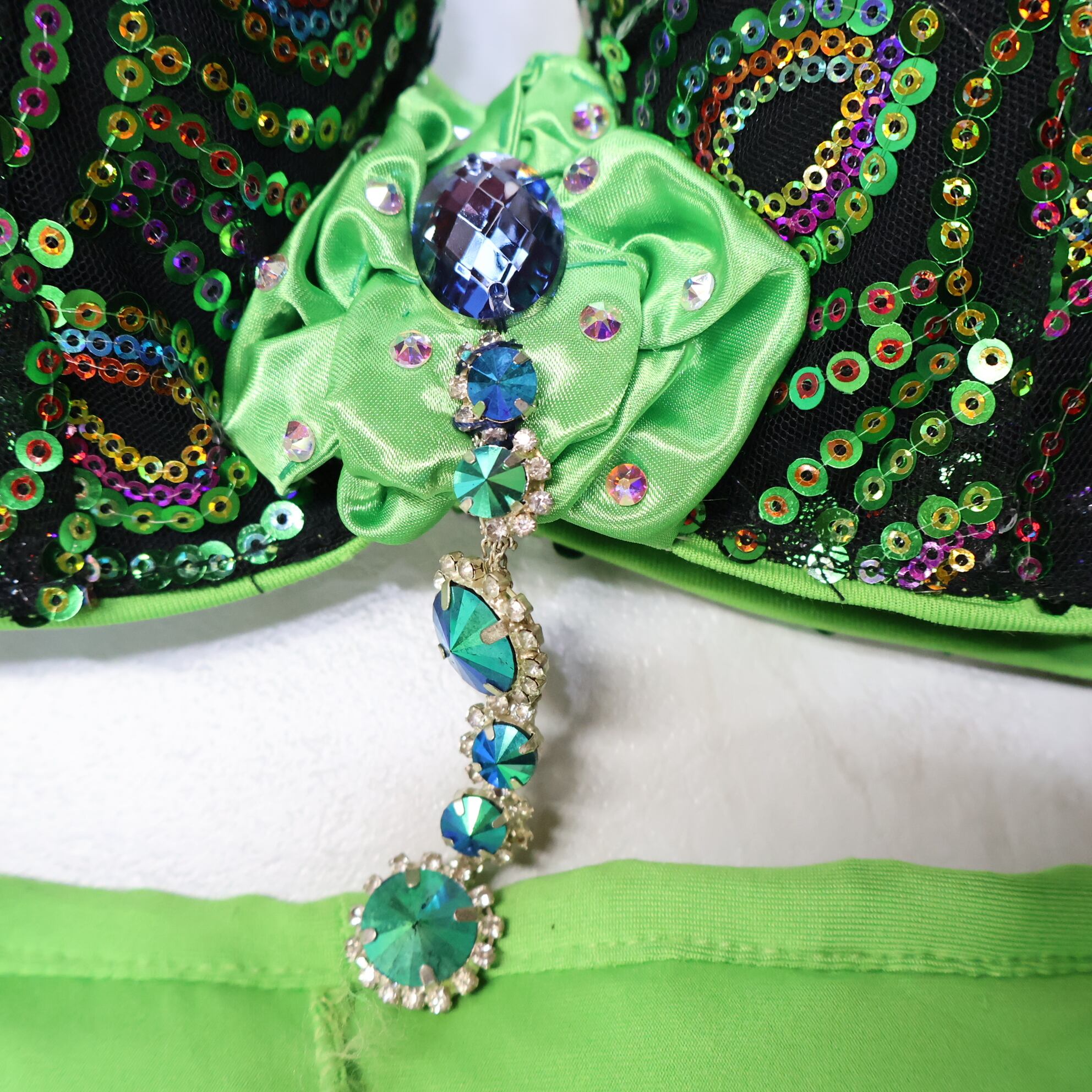 【ベリーダンス用 オリエンタル衣装】グリーン スパンコールラメ レース フリル 緑 カラフル 孔雀柄 煌びやか 豪華 お洒落 ブラトップ スカートセット