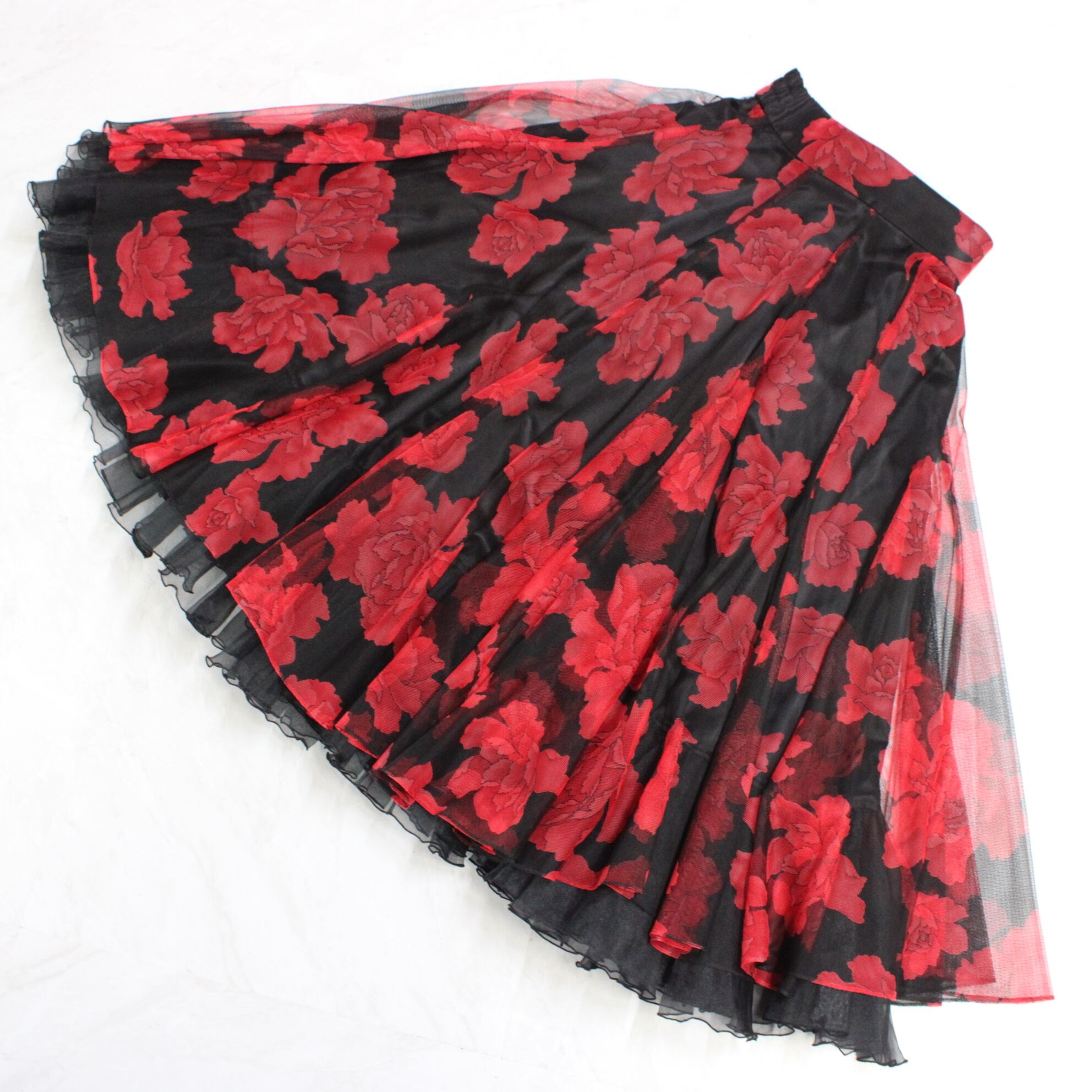 【美品 日本製社交ダンス衣装】スカート BOUTIQUE MUGEN Mサイズ 黒 赤 ブラック レッド 花柄 バラ 薔薇 かわいい 可愛い 派手