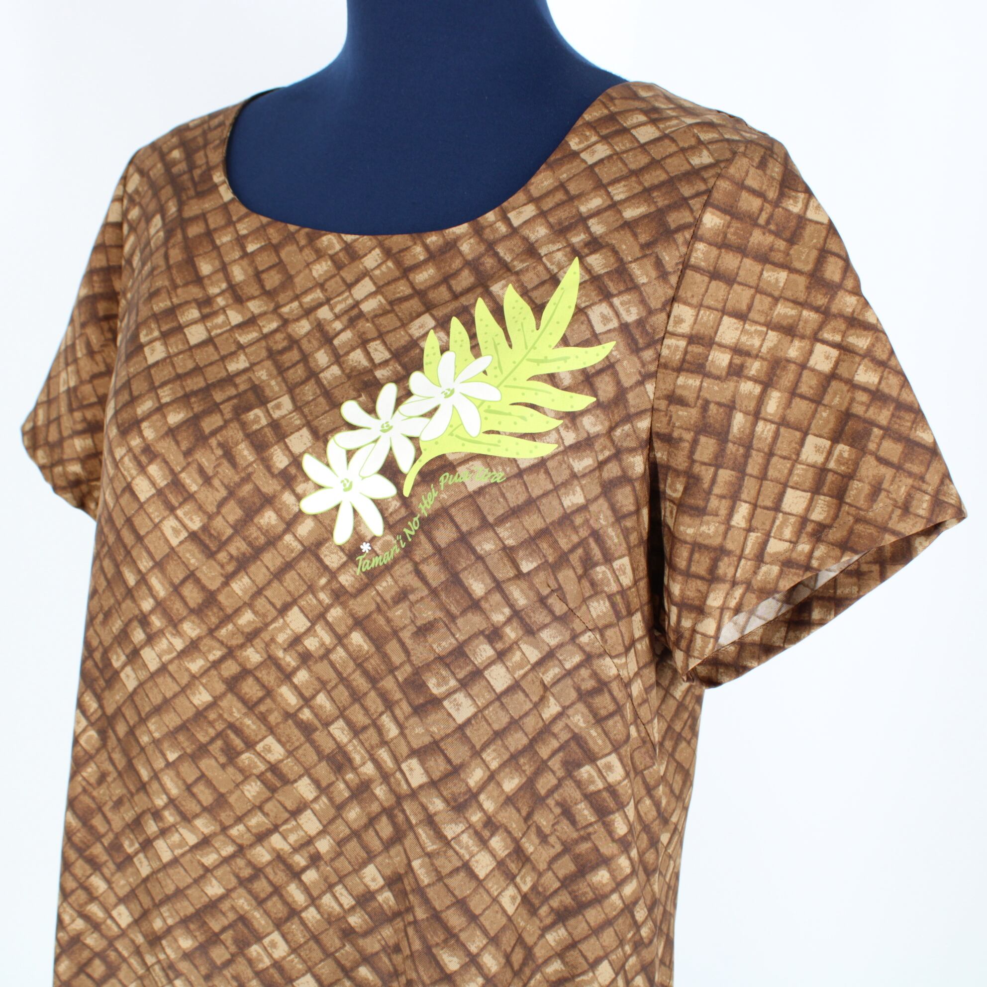 【日本製 フラダンス衣装】ブラウン MENEHUNE PLANTETION メネフネプランテーション ワンピース ドレス ティアレ柄 茶 白 花柄