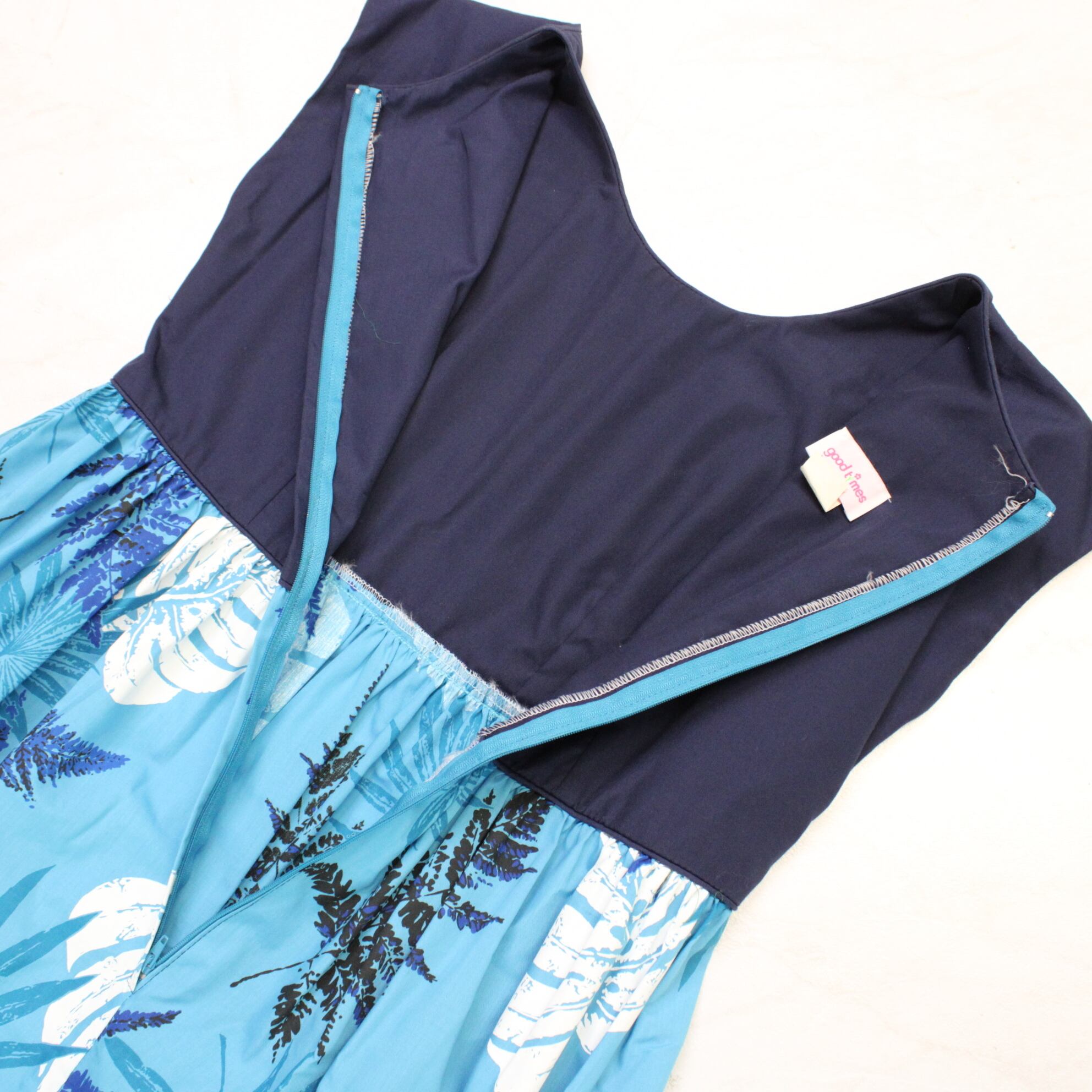 【フラダンス衣装】スカイブルー good times ワンピース ドレス モンステラ柄 水色 ネイビー 紺色 爽やか 袖なし ハワイアン
