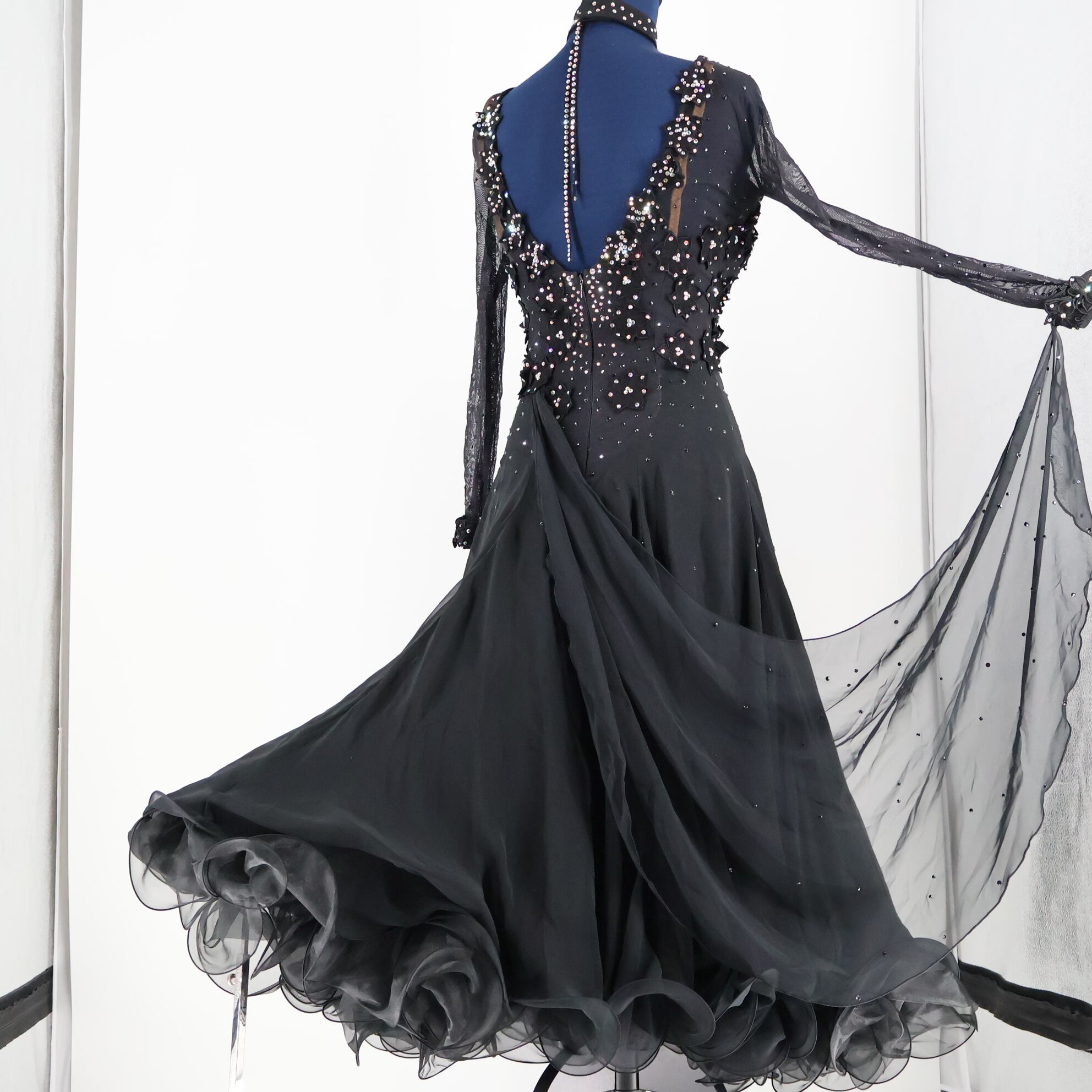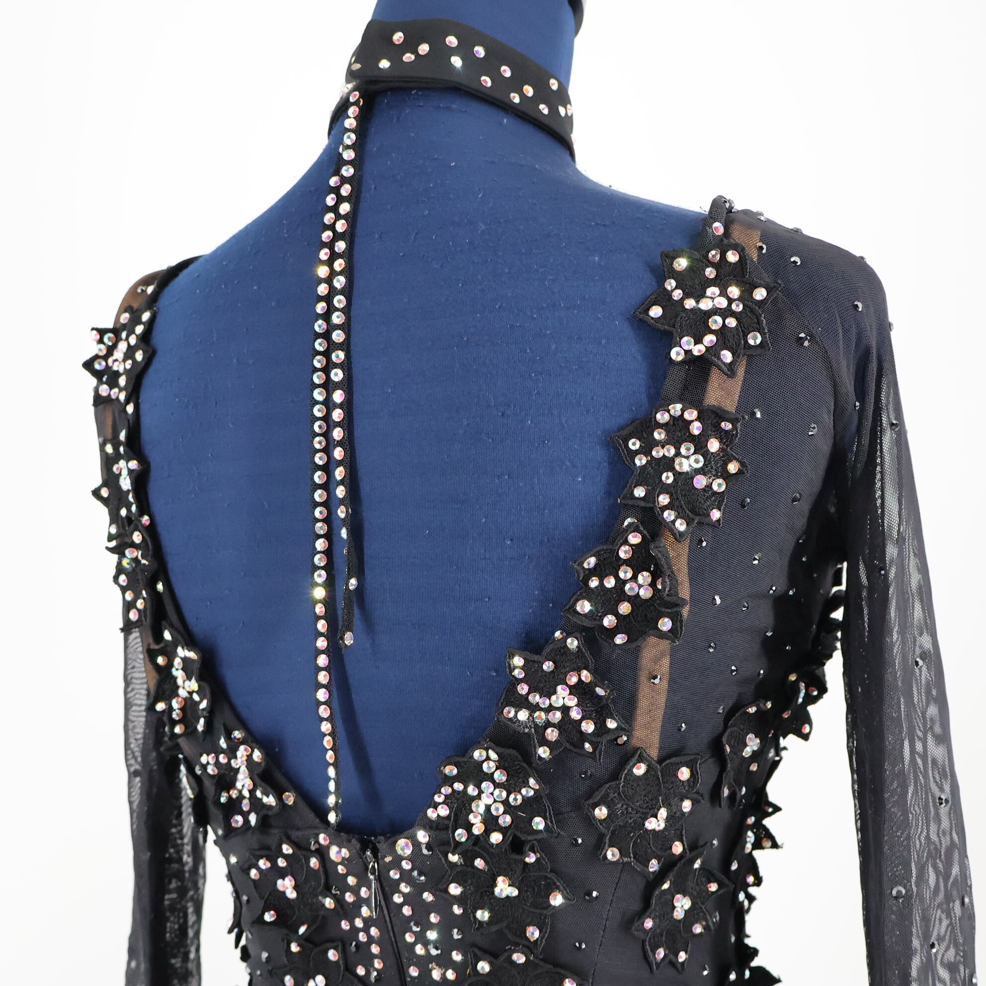 #社交ダンス衣装 #ブラックドレス #フリルデザイン #レース装飾 #フロート付き #ラインストーン #ビジュー #チョーカースタイル #競技用ドレス #デモ用衣装 #発表会衣装 #女性用ダンスドレス #ステージ衣装 #エレガントデザイン #シンプルドレス #華やかスタイル #ダンスコスチューム #上品衣装 #無地ドレス #中古ドレス #ENUTSU