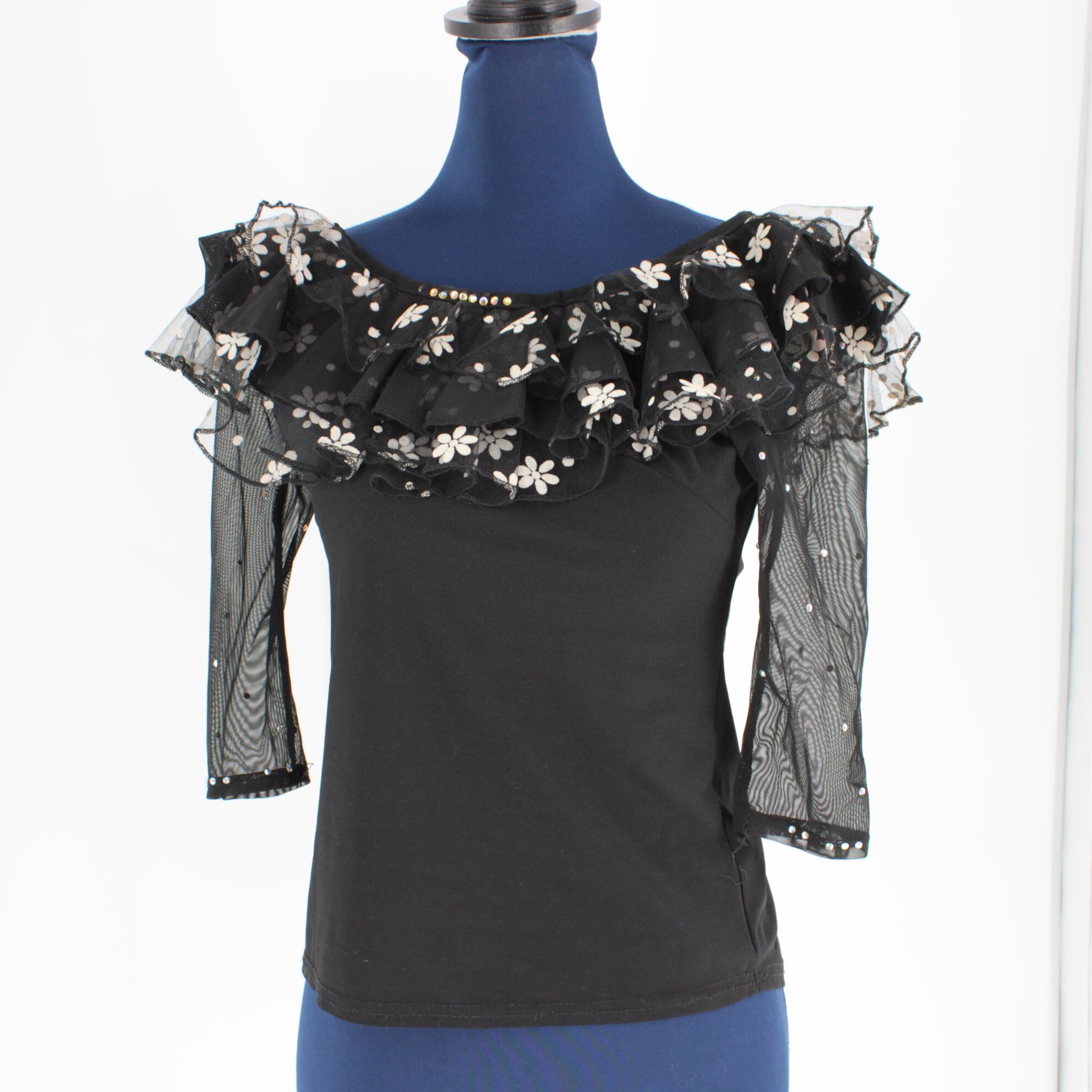 【美品 社交ダンス衣装】トップス ICHIOKU イチオク 黒 ブラック 白 ホワイト 花柄 ラインストーン かわいい レース 透け感